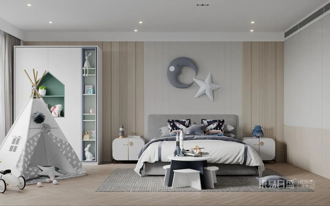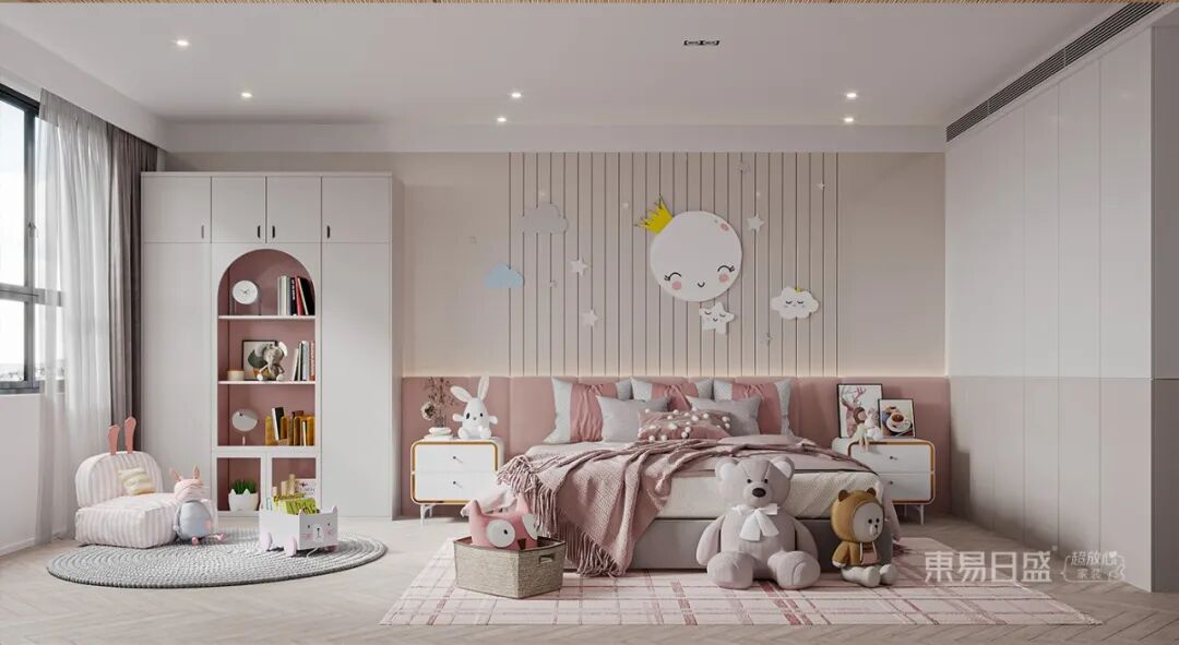 女儿房的配色采用较明亮的粉色调,床品以暖色为主,考虑到儿童居住,整体采用暖色系,弱化色彩对比度,提供舒适又可爱的居住环境。