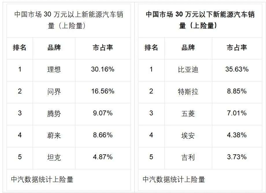 另一个有趣的现象是,在30万元以上的新能源汽车市场中,理想汽车的市场份额已突破30%的大关。与此同时,在30万元以下的市场区间,比亚迪的市场份额同样占据了超过30%的比重。这两个品牌均已成功确立了自己的核心竞争领域,为品牌积累了坚实的用户基础,并形成了积极的增长势头。
