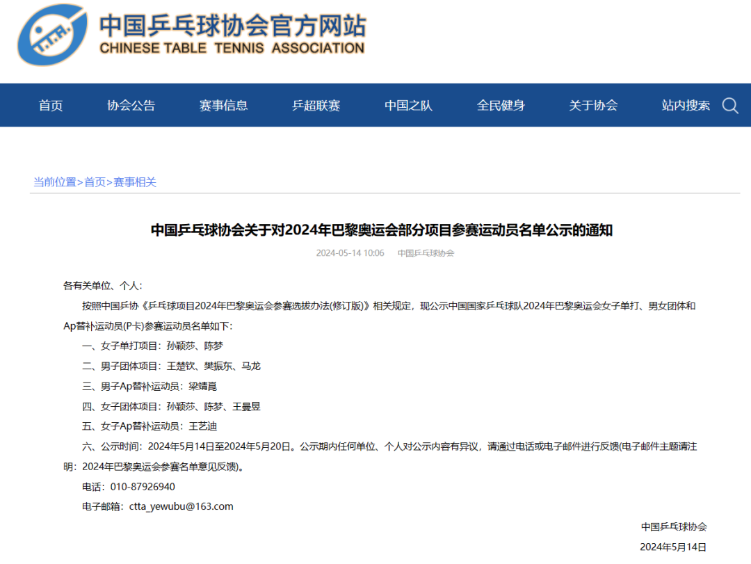 今天,中国乒协官网对巴黎奥运会女单、女团、男团及P卡参赛运动员名单进行了公示。
