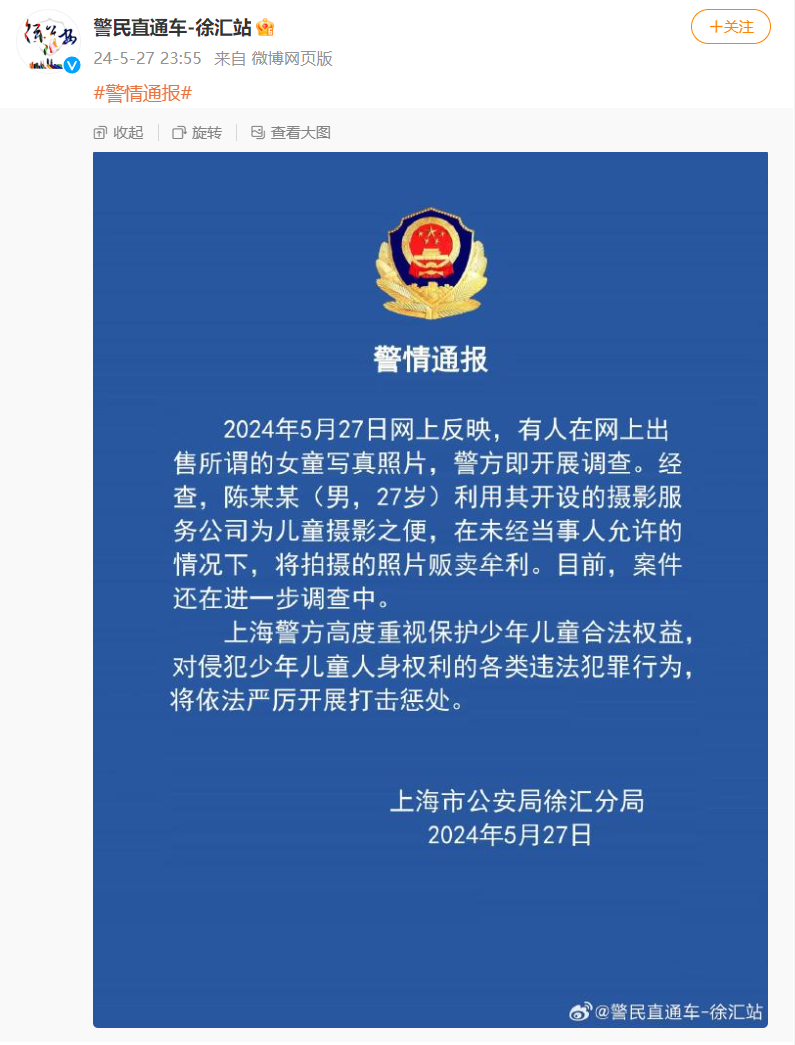 上海公安局徐汇分局通报:2024年5月27日网上反映,有人在网上出售所谓的女童写真照片,警方即开展调查。经查,陈某某(男,27岁)利用其开设的摄影服务公司为儿童摄影之便,在未经当事人允许的情况下,将拍摄的照片贩卖牟利。目前,案件还在进一步调查中。上海警方高度重视保护少年儿童合法权益,对侵犯少年儿童人身权利的各类违法犯罪行为,将依法严厉开展打击惩处。