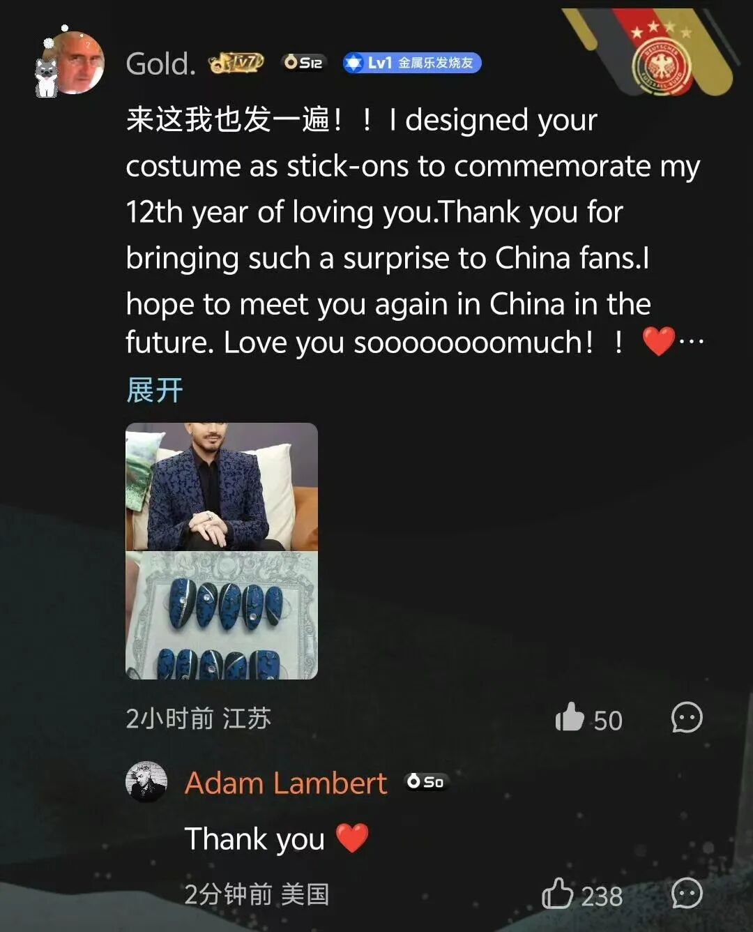 被“翻牌”的并不只有这一位粉丝。亚当空降QQ音乐评论区,生动演示如何用英语花样表示感谢。从“Appreciate you”到“So grateful”再到“Flattered”,让网友在惊喜之余,还能顺便学点儿英语。别看亚当在《歌手》舞台上如此“收敛”,把自己裹了个严严实实,美甲、纹身通通不见踪影,实际上,他的风格是这样:![]()