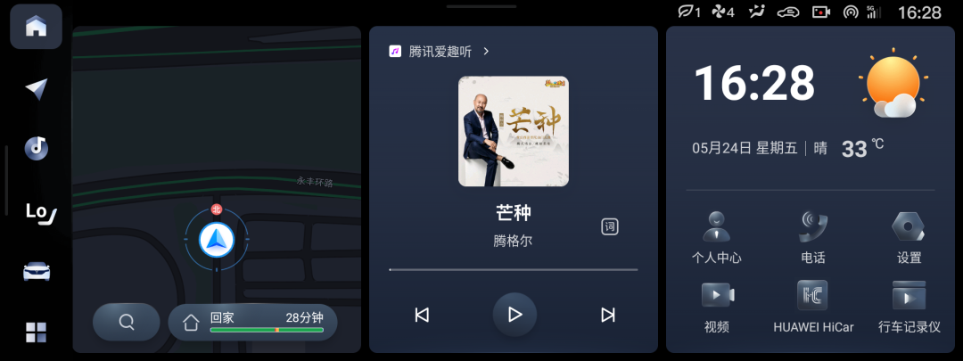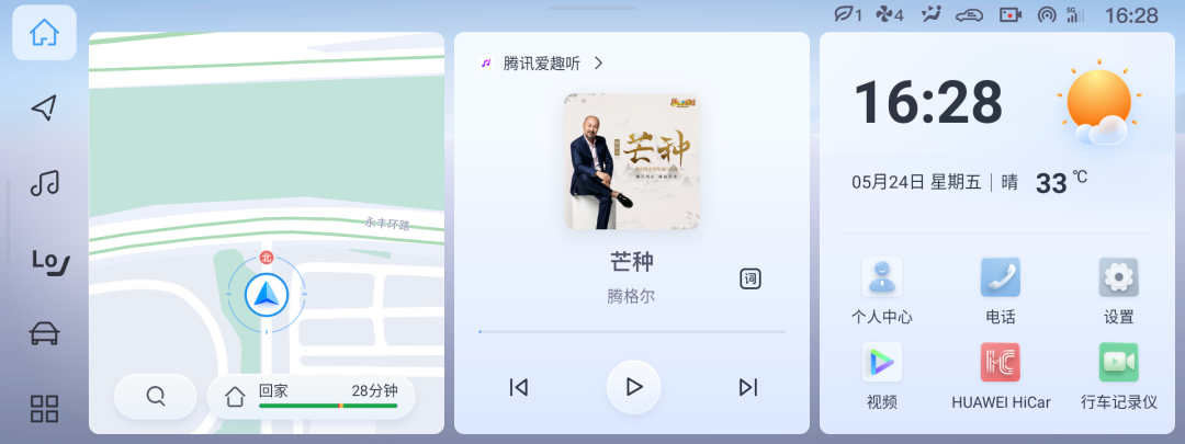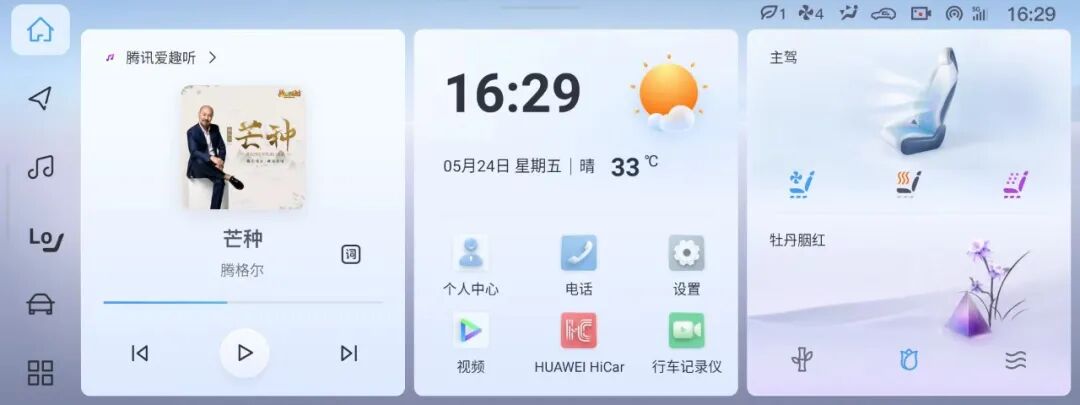 其中,中控屏首页展示更换为地图卡片、媒体卡片和常用功能及应用卡片(如时间、天气、个人中心、华为 HiCar、行车记录仪等),帮您一步直达,直击使用需求。