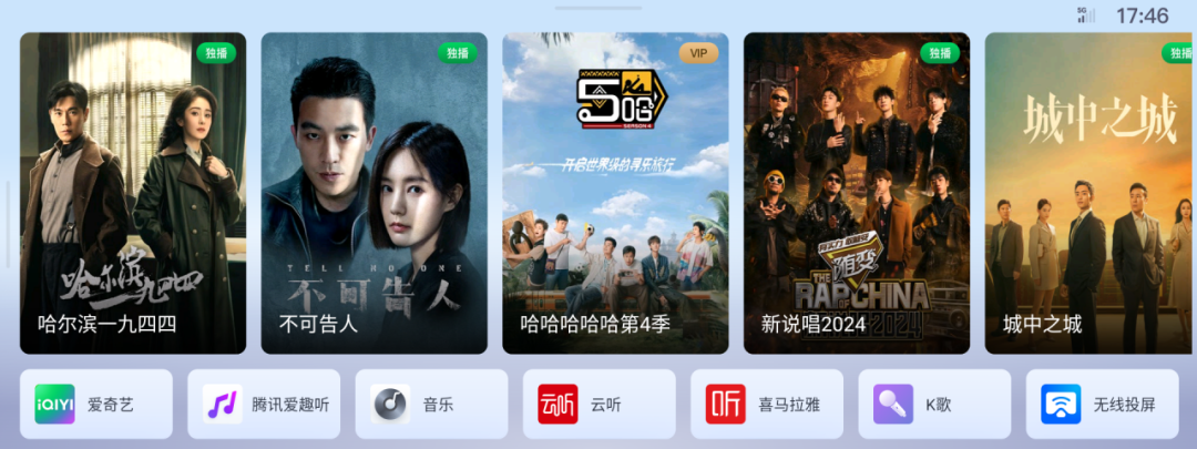 副驾屏首页平铺展示正在热播的影视剧卡片,及常用影音娱乐软件入口,更加美观简洁,多种娱乐选项一目了然。