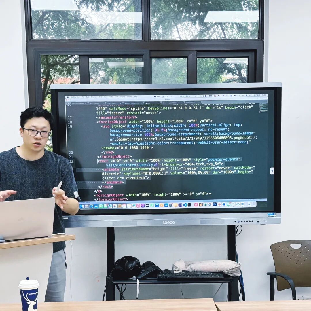 同时,主讲老师计育韬还通过同学们自己的现场实例,进行了无提前准备的现场代码「魔改」,让大家充分感受到了低代码 SVG 创作的创意魅力。
