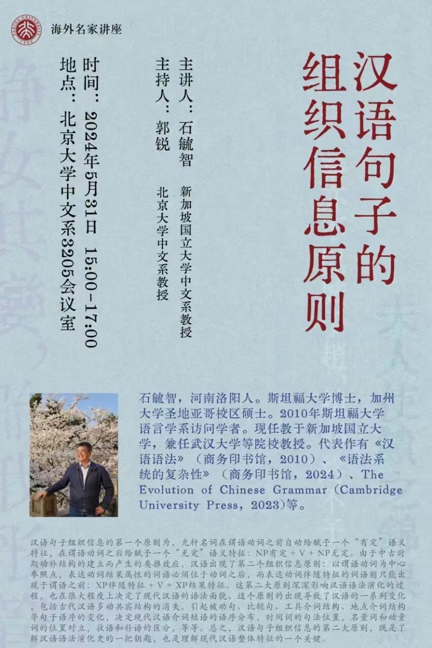 石毓智,河南洛阳人。斯坦福大学博士,加州大学圣地亚哥校区硕士。2010年斯坦福大学语言学系访问学者。现任教于新加坡国立大学,兼任武汉大学等院校教授。代表作有《汉语语法》(商务印书馆,2010)、《语法系统的复杂性》(商务印书馆,2024)、The Evolution of Chinese Grammar (Cambridge University Press, 2023)等。