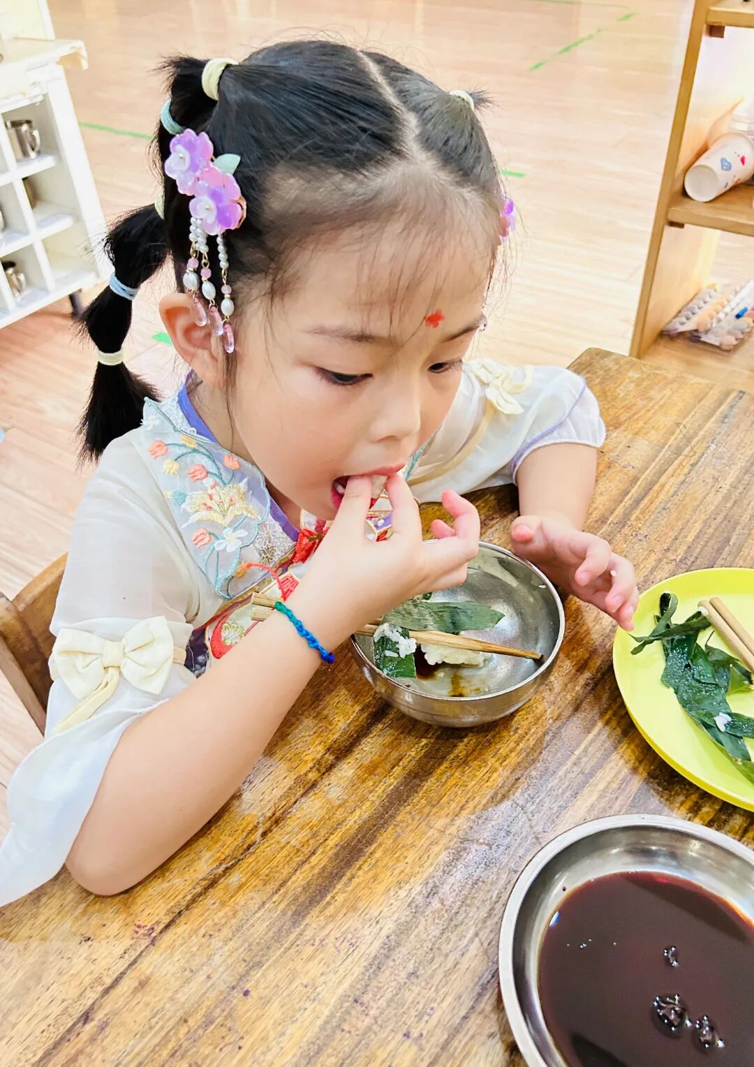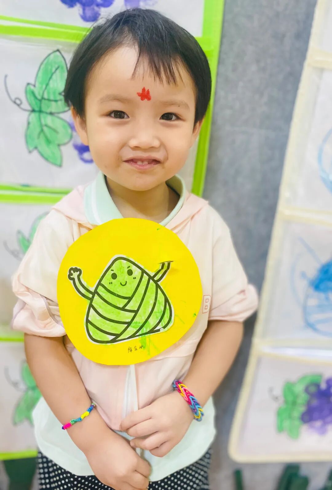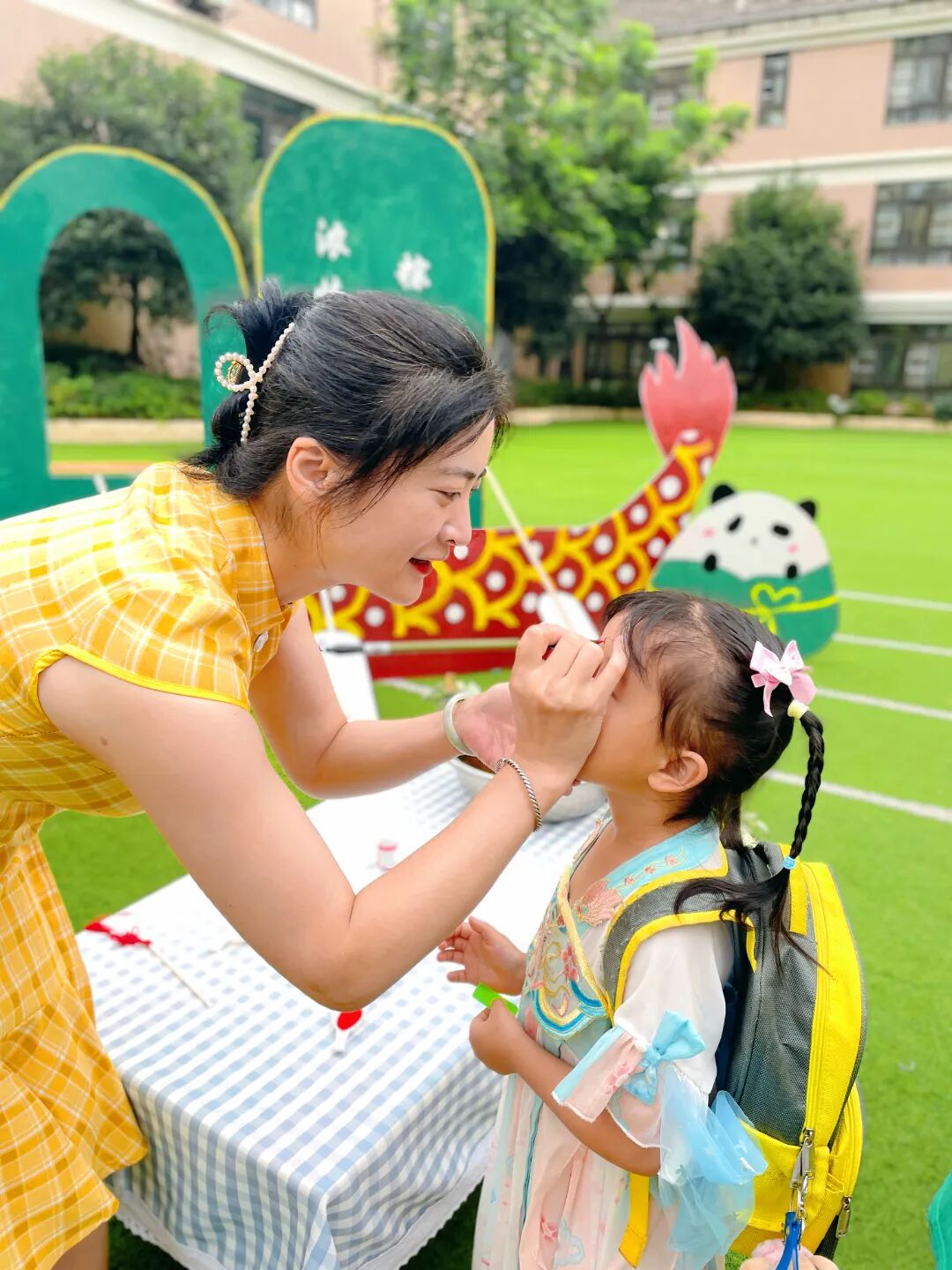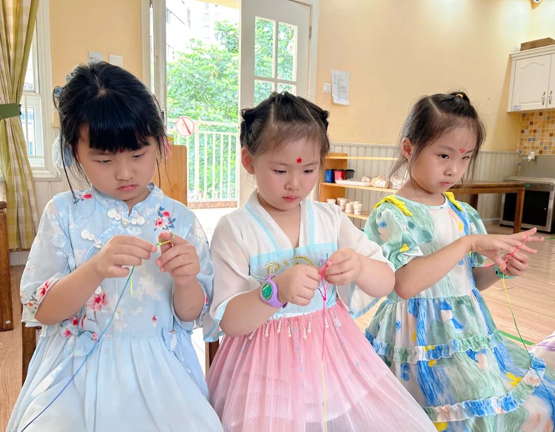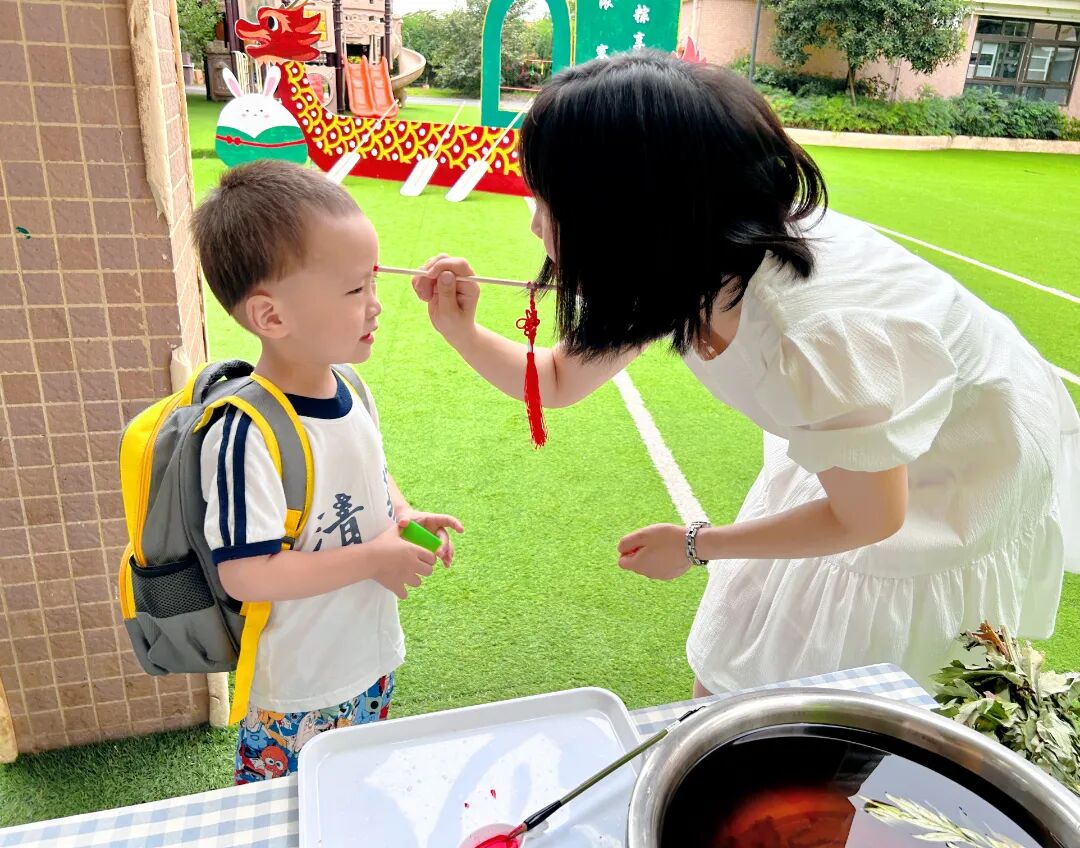 随着清晨的第一缕阳光,幼儿园里已经溢满了端午的节日景象。孩子们穿着精美的古典服饰,开始了端午的入园礼;园长妈妈也静待门口,用传统的点朱砂迎接孩子们的入园。点朱砂俗称吉祥痣,寓意孩子们驱邪避凶、驱蚊防虫,身体健康、平平安安。