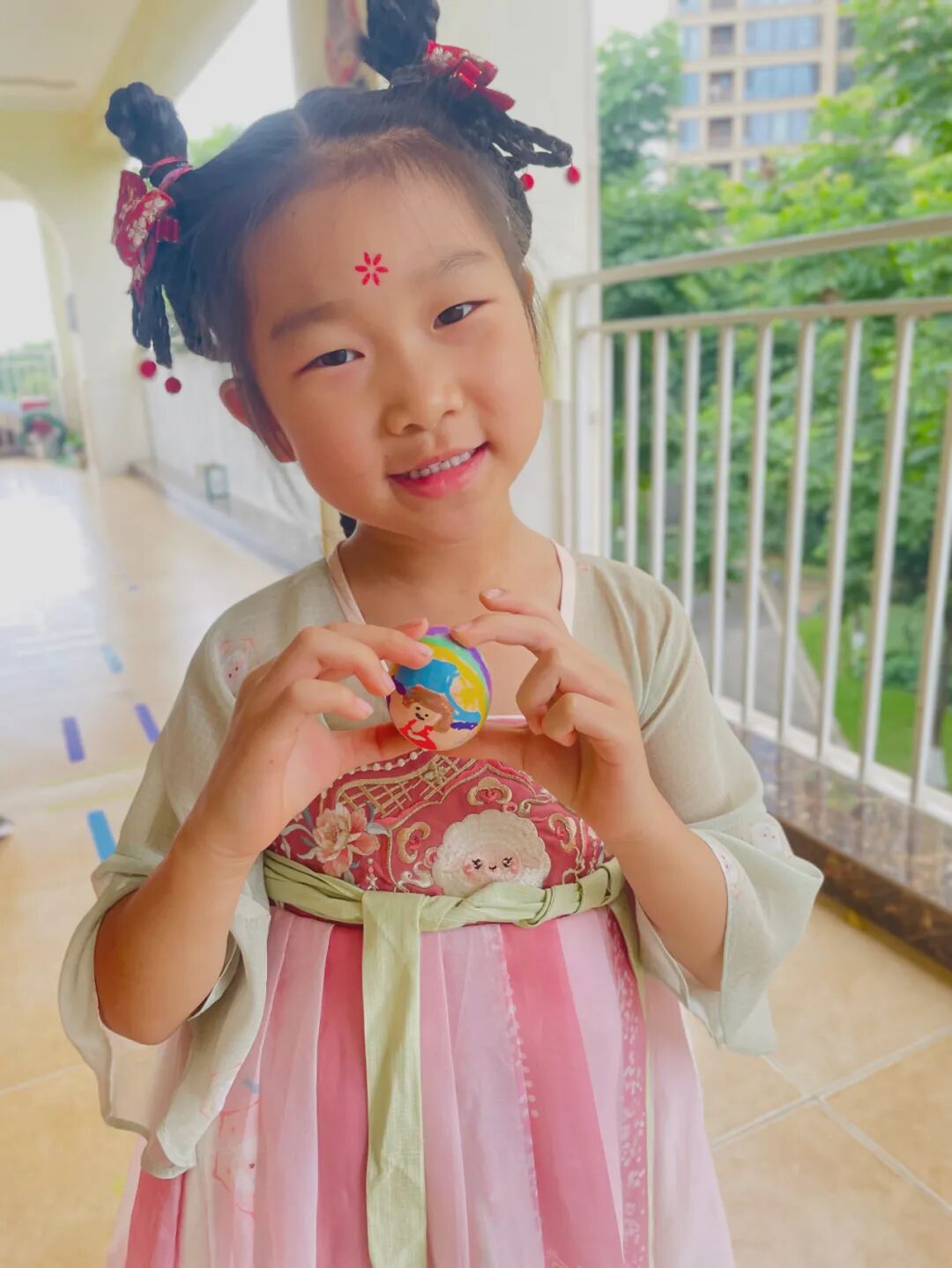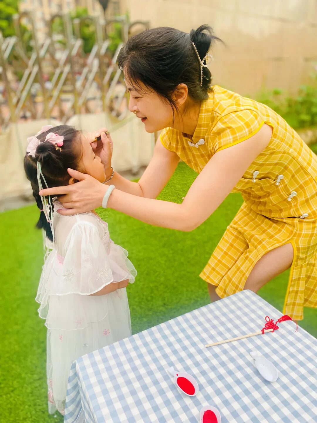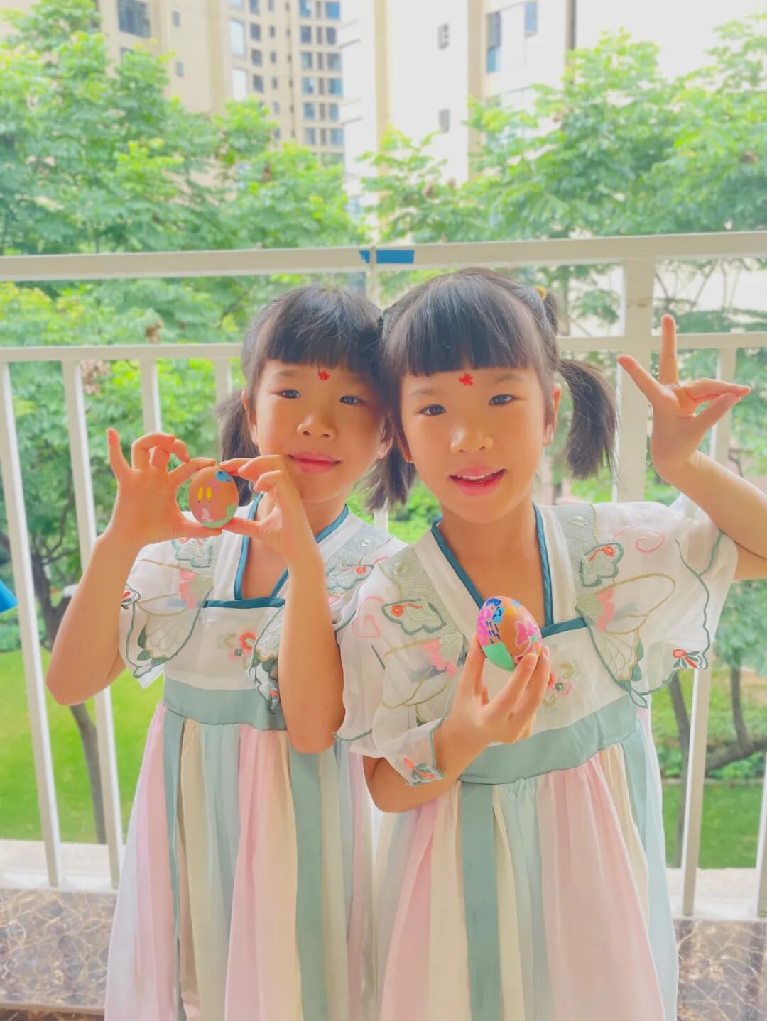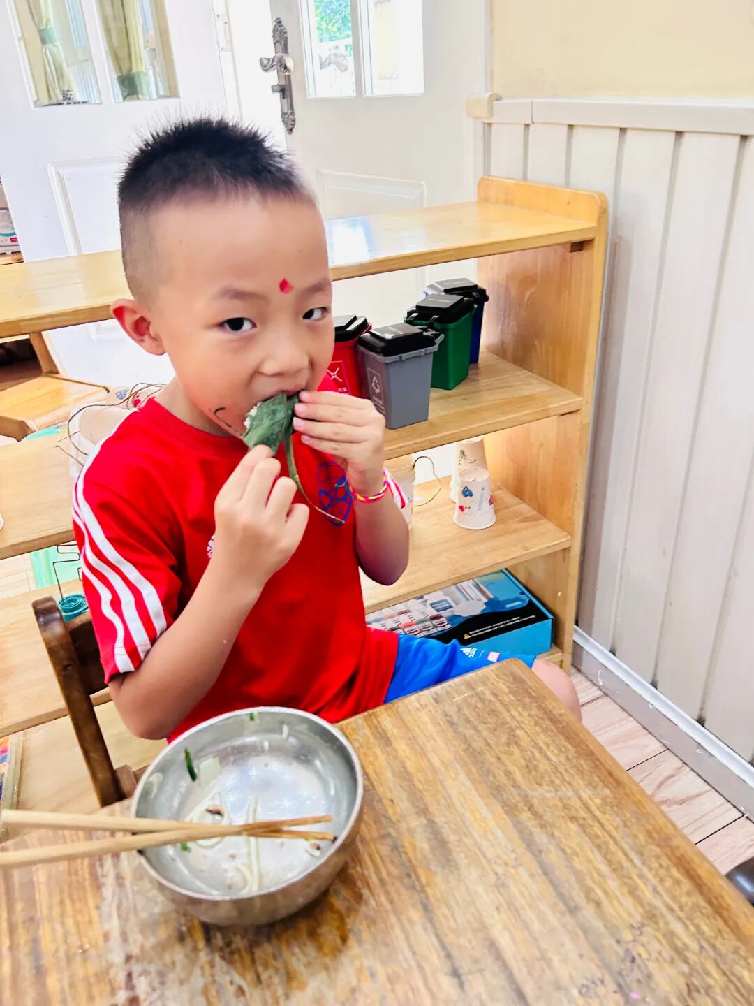 随着清晨的第一缕阳光,幼儿园里已经溢满了端午的节日景象。孩子们穿着精美的古典服饰,开始了端午的入园礼;园长妈妈也静待门口,用传统的点朱砂迎接孩子们的入园。点朱砂俗称吉祥痣,寓意孩子们驱邪避凶、驱蚊防虫,身体健康、平平安安。