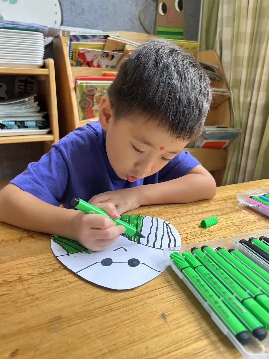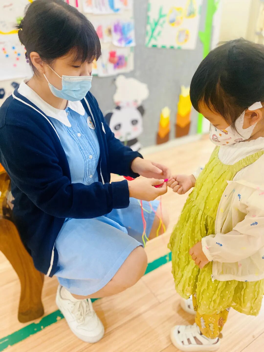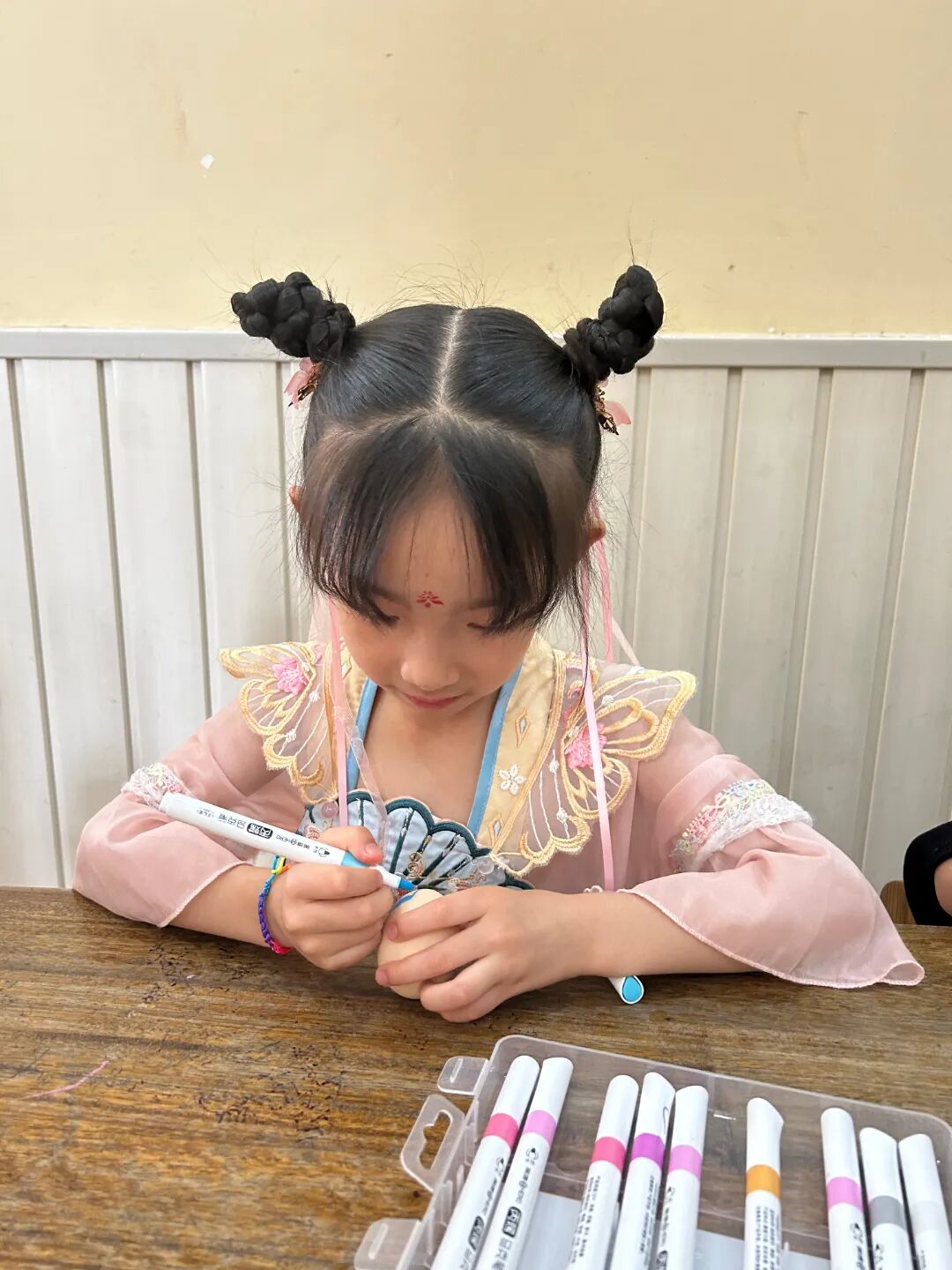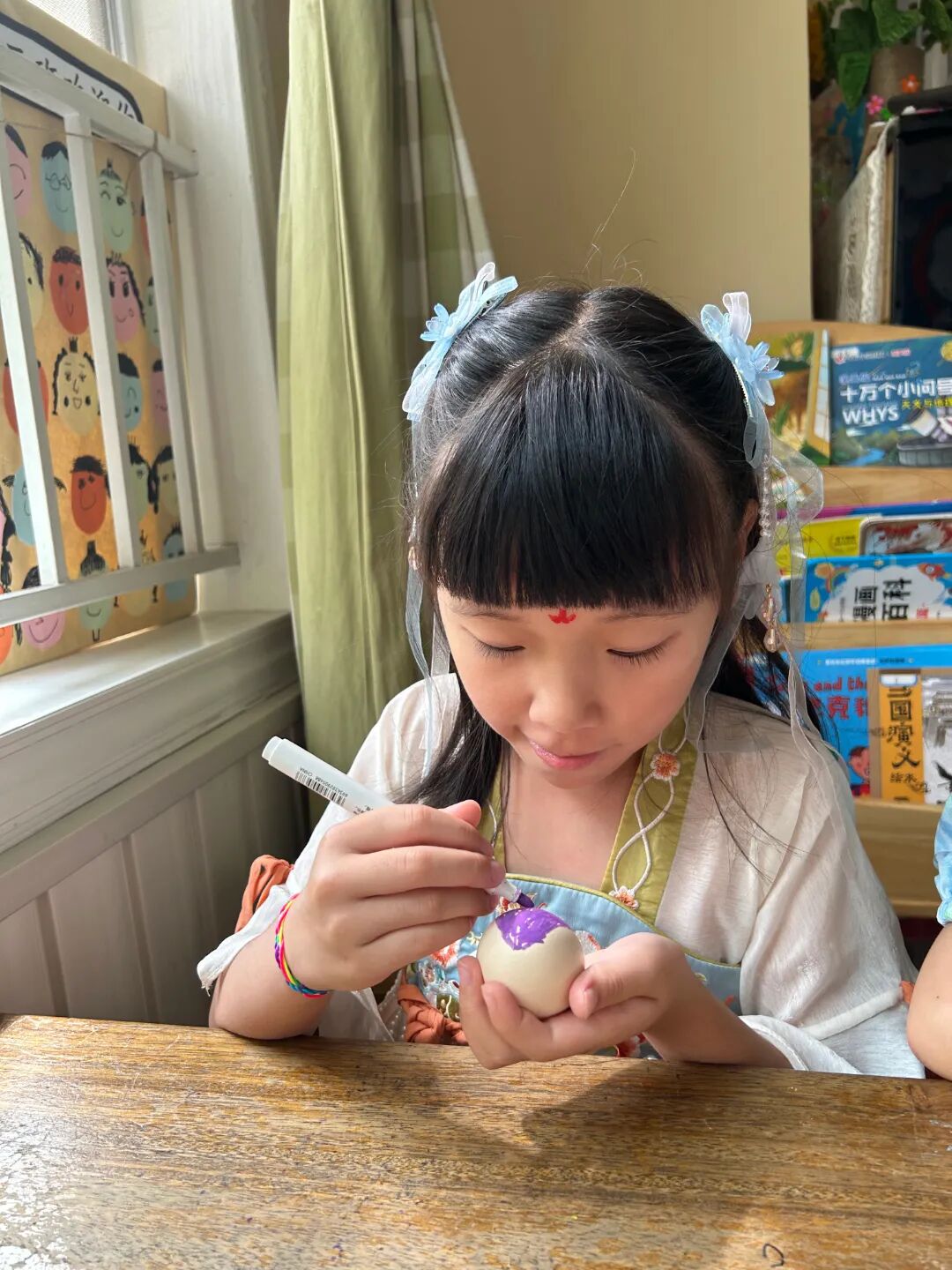 随着清晨的第一缕阳光,幼儿园里已经溢满了端午的节日景象。孩子们穿着精美的古典服饰,开始了端午的入园礼;园长妈妈也静待门口,用传统的点朱砂迎接孩子们的入园。点朱砂俗称吉祥痣,寓意孩子们驱邪避凶、驱蚊防虫,身体健康、平平安安。