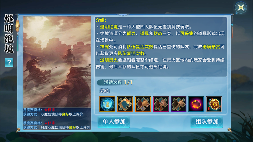 新活动【燧明绝境】上线后,将替换4月20日(周六)20:26开启的心魔绝地活动。活动开启前,少侠可邀请好友组成四人小队,报名流程与心魔绝地活动一致。