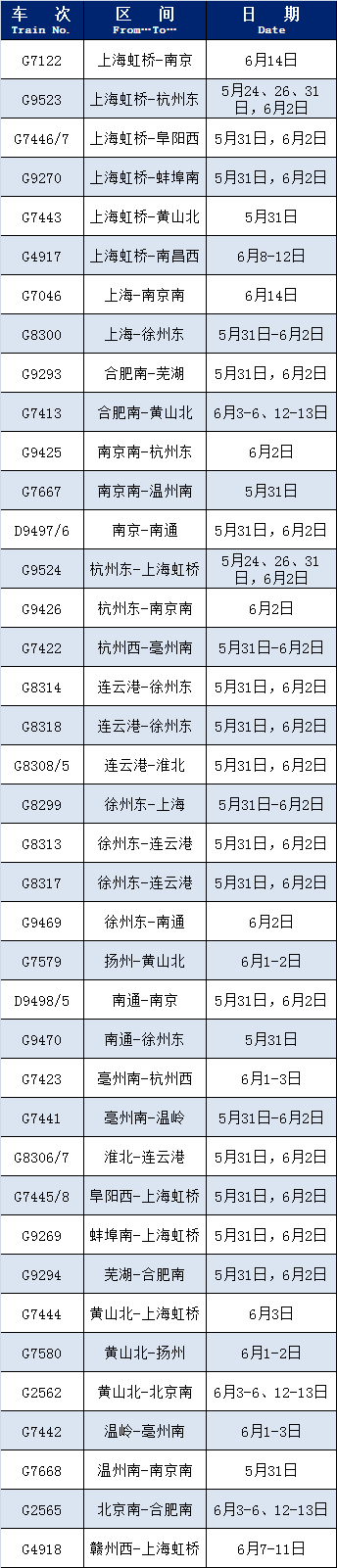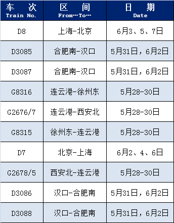 上海铁路客户服务中心介绍,近期根据旅客出行需求,铁路部门恢复和增开了部分旅客列车,恢复开行列车D8(上海-北京)、D3085(合肥南-汉口)等,增开列车包括G7122(上海虹桥-南京)、G9523(上海虹桥-杭州东)等。详见↓