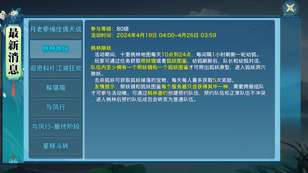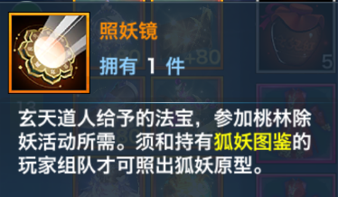 在4月19日-4月26日3:59期间,少侠们完成支线任务可获得照妖镜或狐妖图鉴,且每个服务器只能获取其中一种道具,需要少侠进行跨服组队才能继续参与。