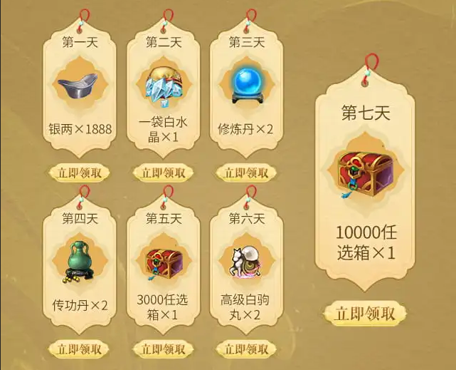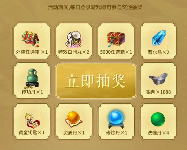 每日登录游戏并在活动界面进行打卡,少侠还可以领取七日好礼,更可以参与抽奖活动,最高可得外装任选箱奖励!