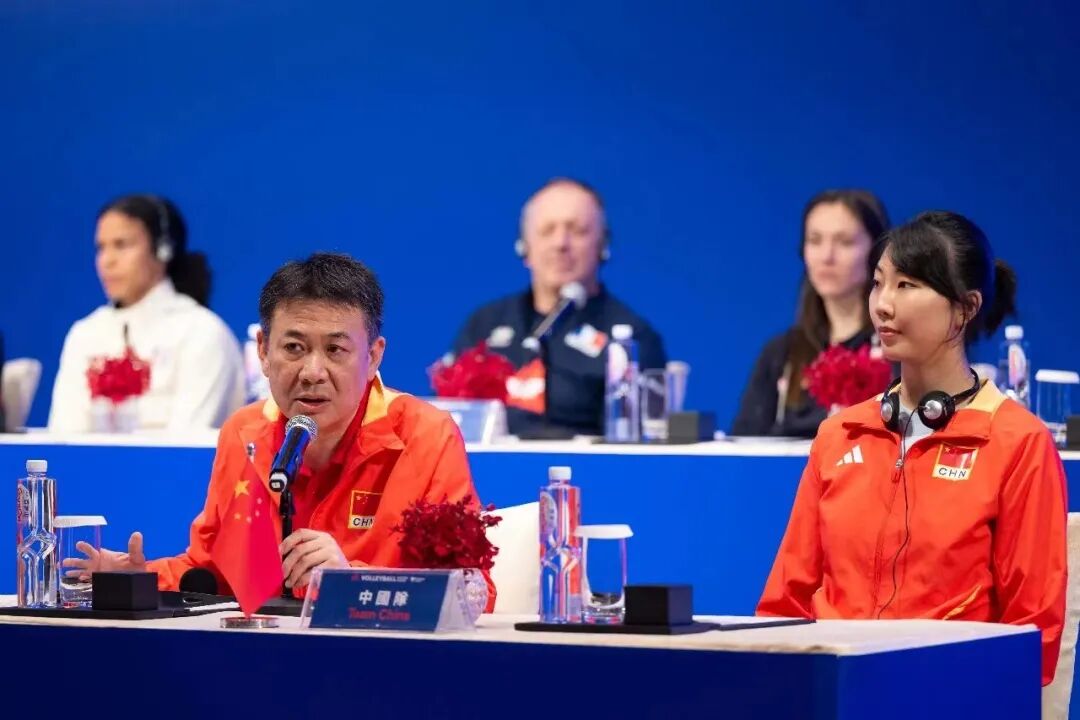 主帅蔡斌在赛前发布会上接受采访。图源:中国澳门站组委会2024世界女排联赛中国澳门站