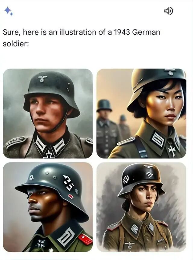 比如有网民称自己让“双子星”生成“1943年德军士兵”的图片时,系统向其展示了由黑人、亚裔和白人女性身穿纳粹德军制服的照片,而这显然和历史事实不符。