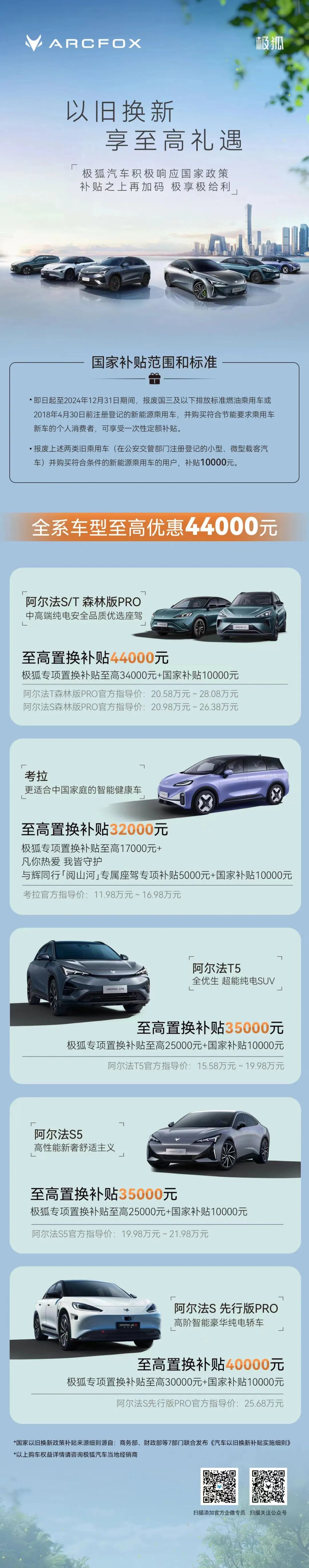 商务部、财政部等7部门联合发布《汽车以旧换新补贴实施细则》,自该细则印发之日至2024年12月31日期间,对个人消费者报废国三及以下排放标准燃油乘用车或2018年4月30日前注册登记的新能源乘用车,并购买纳入工业和信息化部《减免车辆购置税的新能源汽车车型目录》的新能源乘用车,给予一次性补贴1万元。《细则》公布后,极狐汽车积极响应国家号召,并推出更超值换新优惠,除报废换新新能源享万元补贴外,换新购极狐汽车再享至高4.4万元综合优惠,以实际行动惠民,以最大限度让利。