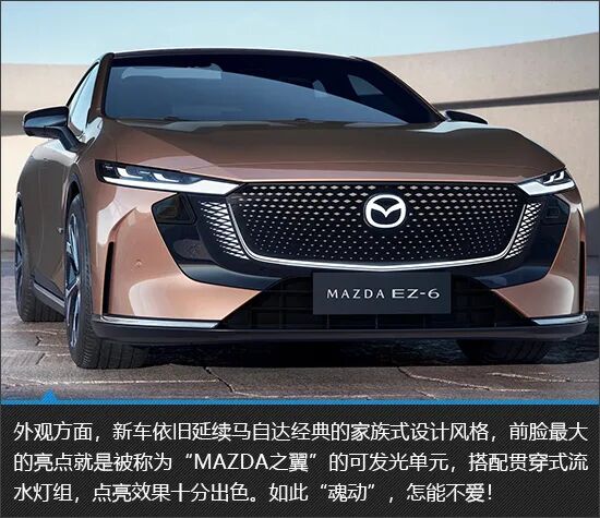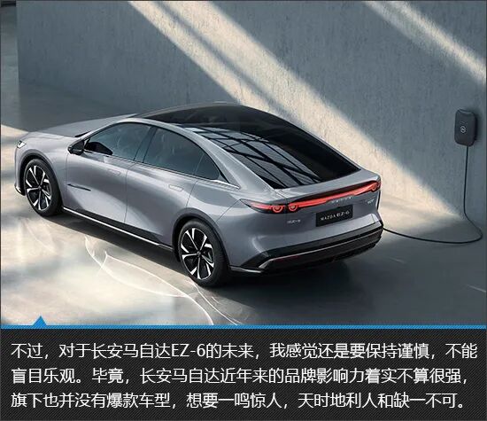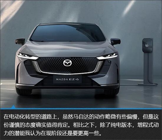 虽然马自达在国内的境遇看似每况愈下,但它毕竟是日本四大汽车制造商之一,因此在底蕴和实力这方面,确实无需担心。在我看来,马自达有两个“魂”最具有代表性,分别为不死的“转子魂”和独具魅力的“魂动”设计理念。2024北京车展,长安马自达带来了基于长安EPA混动平台打造的全新车型——EZ-6。新车可谓是看点颇多,尤其是纯电动和增程式两种动力配置,对于长安马自达来说,其在新能源转型之路上终于是成功迈出了一大步。 从个人情感上来说,马自达的“魂动”设计理念,在我看来绝对能够算是汽车设计领域的第一梯队,不仅动感时尚,而且还显得很有高级感。与其跟随潮流,不如自己引领潮流,马自达就一直是这样做的。倒退十年甚至几十年,马自达的外观设计从来都是它的加分项,无论过去、现在还是未来,相信这样的情况应该都不会改变。 相比于外观部分标志性的“魂动”设计理念,长安马自达EZ-6的内饰造型实在稍显平庸,至少在我看来并没有什么惊喜。虽然迎合主流审美的做法容错率很高,但是因此失去自己的特点和精髓,那就多少有些得不偿失了。或许,像马自达3 昂克赛拉那样独特且有韵味的内饰设计,以后都不会再有了。 长安马自达EZ-6从某种角度来看,完全可以将其视为马自达6的“升华版”。其中,E代表电动,而Z代表零排放,无一不是在彰显长安马自达向电动化转型的决心。站在马自达的角度,如果说转子是情怀,那么新能源转型就是实际生活中必要的“柴米油盐”,毕竟只有生存下去,才能有机会完成梦想。 马自达重回主流赛道,带来了划时代的重要车型——长安马自达EZ-6。这话听上去很带感,不过背后的辛酸和无奈或许只有自己知道。马自达是很有情怀,但情怀并不能当饭吃,没有任何一家汽车品牌会不在乎产品销量,因为这就是生存下去的必要基础。从个人情感上来说,我是很希望长安马自达EZ-6能够成功,但是以现在竞争激烈的大环境来看,确实困难重重,只能说,祝好运吧!
