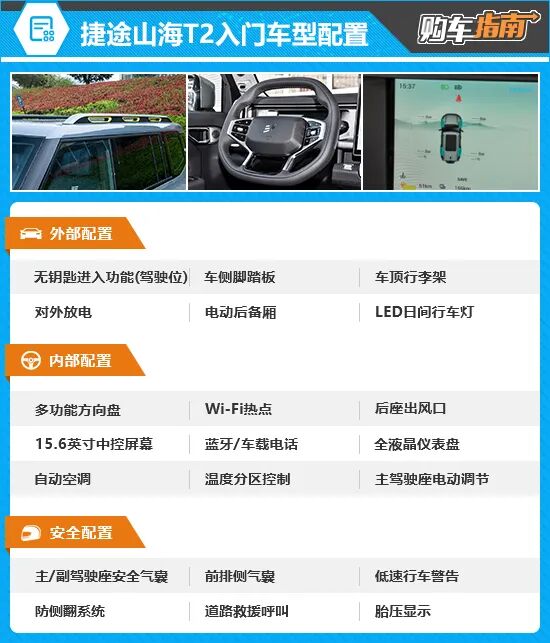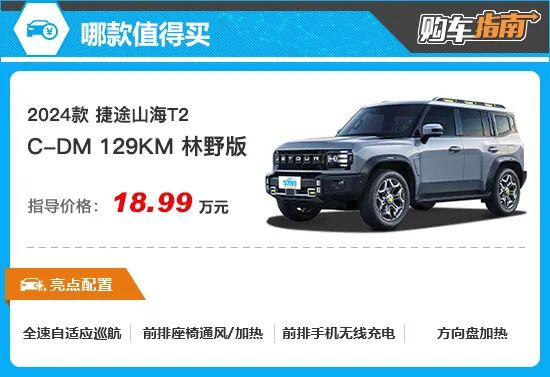 车身颜色方面,新车提供4种外观颜色可选,其中极夜黑、雪山银及烟雨青3款配色为新车标配,公路灰配色则需单独加价3000元进行选装。虽然颜色选择并不多,但却各具特点,消费者可以根据喜好酌情选择。 内饰方面,新车采用“T”字形布局,并保留大量的实体按键,方便用户在驾驶时的盲操作。15.6英寸的悬浮式中控大屏内也集成了车内大部分的操作功能,还搭载了一颗高通骁龙8155芯片,增强车机流畅度。细节方面,圆角矩形的出风口、平底四辐式方向盘及多种皮质材料的搭配,让整车看上去更有质感。 动力部分,2024款捷途山海T2全系搭载1.5T涡轮增压发动机和前置双电机组成的插混系统,并匹配一台3挡混合动力专用变速箱。根据车型配置不同,CLTC纯电续航里程分别为129km和208km,WLTC综合油耗约为1.41L/100km和0.93L/100km。 2024款捷途山海T2的入门版车型为2024款C-DM 129KM 原野版,售价17.99万元。即使是入门版车型,但其配置表现依然可圈可点,例如驾驶位无钥匙进入功能、电动后备厢、多功能方向盘、主驾驶座电动调节、前排侧气囊等配置均有配备,可满足日常使用。不过在辅助驾驶及舒适性配置等方面,入门版车型的表现不尽如人意,因此不作重点推荐。