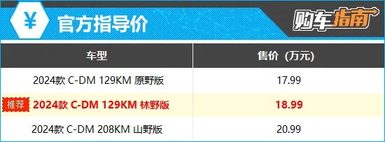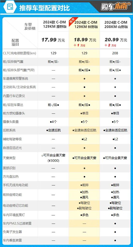 综合配置及价格来看,个人更推荐指导价为18.99万元的2024款 C-DM 129KM 林野版。对比配置来看,推荐车型虽然比入门版车型贵1万元,但在主动安全、辅助驾驶以及舒适性配置方面均有着较大幅度的升级,例如主动刹车/主动安全系统、L2级辅助驾驶、前排座椅加热/通风、前排手机无线充电等配置均有配备,性价比较高。 而顶配车型比推荐车型贵出2万元,虽然在CLTC纯电续航里程上有所增长,但其与推荐车型相比新增功能并不多,例如负离子发生器、车内香氛装置等都属于锦上添花的配置,可有可无,因此性价比不高。 综上所述,2024款 C-DM 129KM 林野版车型性价比相对较高,消费者在购车时可以优先考虑。