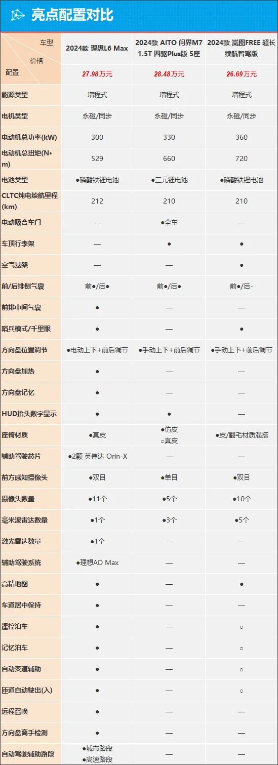 前两年,理想汽车之所以能取得不错的销量成绩,最主要的原因在于选择了增程式这个小众的赛道。但现如今,同样采用增程式动力的SUV车型如雨后春笋般推出。其中问界M7和岚图FREE就是比较有代表性的车型,它们都有自己独特的亮点,并且有着不错的市场表现。接下来,我们就将问界M7和岚图FREE列为竞争对手,看看理想L6能否与之抗衡。 首先从售价来看,理想L6和问界M7的起售价完全一致,均为24.98万,可见理想L6是有备而来,就是为了瓜分问界M7的市场份额。并且理想L6的顶配售价相比问界M7也要低了不少,购车成本更低。而岚图FREE仅有一款在售车型,比理想L6的起售价要贵不少,但略低于顶配车型。车型数量方面,问界M7拥有7款车型可选,理想L6仅为2款,可选择余地相对较少。 配置对比环节,尽可能选取三款价格相近的车型进行对比。相比于竞品,理想L6配备了电动上下+前后调节方向盘、方向盘加热、真皮座椅等,能够有效增加日常用车的便利性和舒适性。而问界M7配备了全车电动吸合车门,更具高级感。岚图FREE则独占了空气悬架,拥有更出色的悬架表现。可以看出,在常规配置方面,三款车型都各有特点,谁也不能完全将对方比下去。不过在智能化配置方面,理想L6占有绝对的优势,拥有2颗英伟达Orin-X辅助驾驶芯片、11个前方感知摄像头、1个激光雷达等驾驶硬件,令其拥有出色的驾驶辅助能力,更符合当下消费者的用车习惯。 作为全新车型,理想L6是否会出现质量问题的隐患?对此,我们将从过去一年理想品牌旗下车型的故障问题入手,通过对故障问题的分析,从而初步预测未来新车质量问题的发展趋势。 据车质网数据显示,理想汽车旗下车型近一年质量投诉故障点数量相对较多的是“座椅故障”和“驾驶辅助系统故障”,主要集中在理想L7车型。考虑到理想L6采用了带有舒适海绵的Nappa真皮座椅,以及配备最新的AD Pro和AD Max两种智能驾驶辅助配置,因此可暂且认为其出现上述问题的几率较低,具体情况如何,还要待其使用一段时间后才能有定论。 随着我国汽车市场的不断发展,品牌售前/售后服务的水平高低,购买体验的好坏已逐步成为影响消费者最终购买的重要因素。因此我们将基于车质网大数据,通过对过去一年品牌普遍存在的服务问题进行分析,为消费者购买车型提供更为客观的参考依据。 从服务投诉问题点来看,“销售承诺不兑现”投诉量相对较高,通过进一步分析可知,该问题主要来自于理想L7车型。此外,部分消费者反馈理想汽车还存在“隐瞒相关信息”、“出售问题车”等问题。 在衡量新车售后服务口碑方面,我们将通过企业对于车主投诉的回复情况进行分析,相对客观地对于新车未来的售后服务口碑有所预判。据车质网数据显示,近一年理想汽车品牌投诉的回复率为47%,在同期自主品牌中排名中下游,可见厂家对于车主诉求的重视程度还有待提升。 购买理想L6的用户可享受整车质保5年或10万公里、三电系统质保8年或16万公里等基础权益(详情请咨询当地经销商)。 车辆购买后势必要涉及到车辆的日常保养,这时品牌经销商门店的数量多少以及分布情况就很重要,甚至会对消费者是否购买该品牌车型产生一定影响。据车质网数据统计,理想汽车目前在国内的经销商门店共326家,覆盖31个省、自治区和直辖市,其中广东、浙江和江苏省的经销商数量相对较多。 通过本期《质选车》可以看出,作为理想品牌旗下目前售价最低的车型,理想L6在舒适性配置和智能化方面也保持了品牌应有的水准。并且面对强大的竞争对手,理想L6在竞品中的表现也可圈可点,不仅售价区间相对较低,而且像是当下备受追捧的智能驾驶辅助配置,理想L6更是占有绝对的优势。据悉,理想L6上市72小时累计定单已突破10000台,相信凭借这样势头,理想L6有望承担起销量重任。