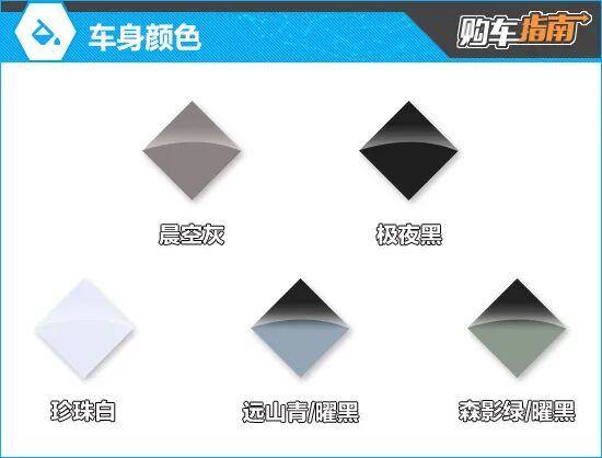 车身颜色方面,新车共有5种车身颜色供消费者选择。除3种常规车身颜色外,还提供了远山青/曜黑、森影绿/曜黑两种双拼色可选,但只有顶配和次顶配车型支持选装,价格为3000元。个人比较推荐的是远山青/曜黑配色,视觉效果更加时尚。
