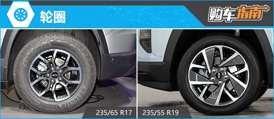 雪佛兰探界者Plus提供了两种不同样式的轮圈可选,采用双色设计,运动感十足。其中,入门款配备的轮胎规格为235/65 R17;其余3款配置车型轮胎规格为235/55 R19。此外,顶配和次顶配车型还支持选装235/65 R17规格轮胎。