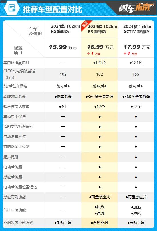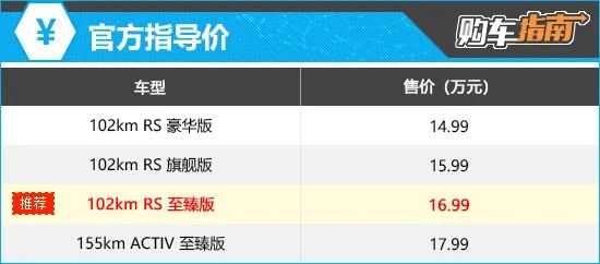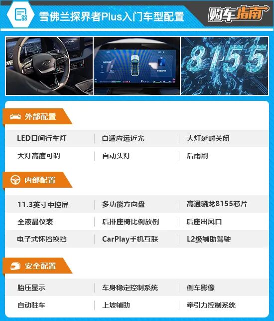 动力方面,雪佛兰探界者Plus搭载由1.5T涡轮增压发动机+电动机组成的插电式混合动力系统,系统综合功率272kW,综合扭矩565N·m。电池方面,根据配置提供16.5kWh和24.4kWh两种容量电池,对应的CLTC纯电续航里程分别为102km和155km。 雪佛兰探界者Plus的入门款车型为102km RS豪华版,售价为14.99万元。虽身为入门款,但配置表现并不逊色,包括后座出风口、高通骁龙8155芯片以及L2级别辅助驾驶等都有装备。另外,入门款车型在主被动安全性方面也是和其他3款配置车型保持同步,配置表现可圈可点。不过,由于入门款车型在实用性和舒适性配置方面有所欠缺,因此不是本次的最佳推荐。 综合配置表现和价格因素,个人首推售价16.99万元的102km RS 至臻版。相比低一个配置车型,补上了在智能驾驶辅助和舒适性配置方面的欠缺。例如,在智能驾驶辅助方面增加了车道居中保持、道路交通标识识别、自动泊车入位等功能配置;实用性和舒适性配置方面增加了电动后备厢、感应后备厢、前排座椅加热/通风等功能,这1万元的花费显然是物超所值的。 155km ACTIV 至臻版车型与推荐车型相比,主要是将CLTC纯电续航里程由102km提升到了155km,配置上增加了对外放电功能,以及座椅材质由真皮改为皮/翻毛材质混搭。对于大多数消费者来说,102km的纯电续航里程已经足够日常使用,多花1万元增加53km续航,实际意义并不大。 综上所述,个人认为还是售价16.99万元的102km RS 至臻版最值得优先考虑,整体的配置表现更加均衡,保障了驾乘舒适性,消费者在选择时可以优先考虑。