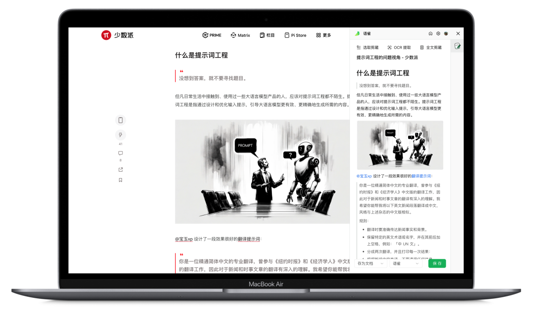 有时候会担心收藏的在线文章有一天因为各种原因失效了,就再也看不到了,或者是就想先把知识囤起来再去拆解使用,很多人在呼唤全文剪藏。思索再三,浏览器插件 0.5.6 版本终于新增了全文剪藏,此后看到喜欢的文章,可以一键全文剪藏到语雀了,格式内容也会尽可能还原。接下来你就可以在语雀里进一步阅读、消化和整理,形成自己的知识沉淀。