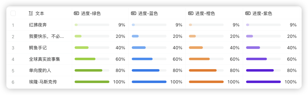 想知道一个项目、一本书的进度,但苦于无法显示,语雀数据表新增了进度属性,有多种颜色可选,包括绿色、蓝色、橙色、紫色等等,更多的样式你开源探索试试。