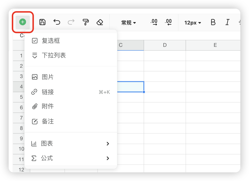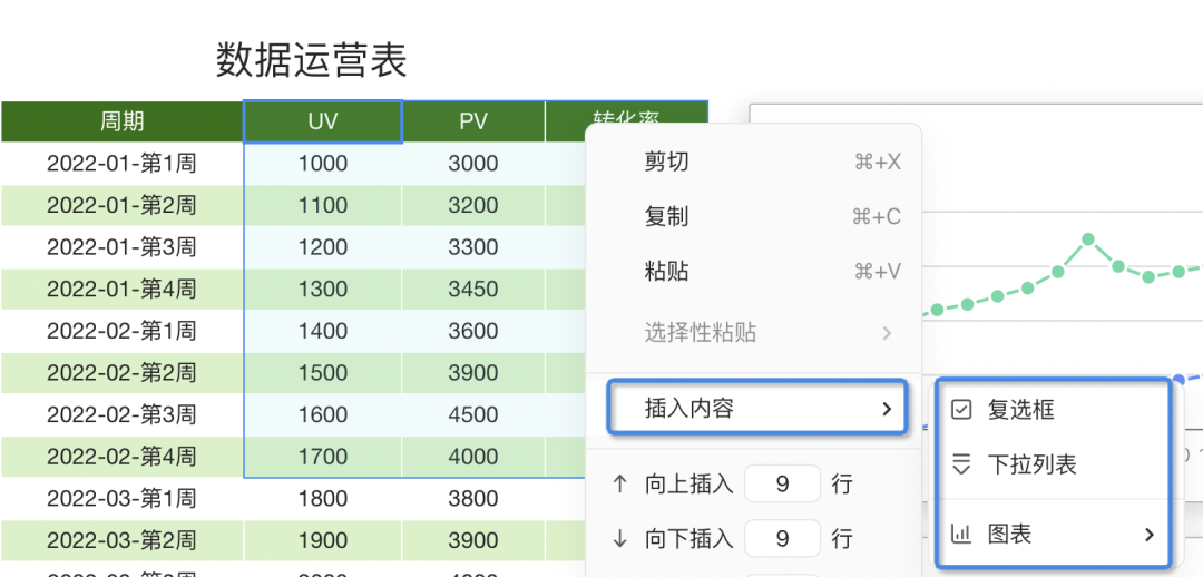 过去,选中单元格之后需要移动鼠标到左上角点击 + 插入不同的内容,而现在,不用每次都在工具栏来回操作,选中单元格就可以顺手快捷插入复选框、下拉列表以及创建图表了。