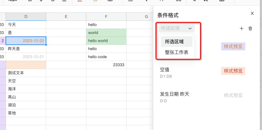 还支持按选区、工作表不同范围来管理条件格式,在条件叠加时可以根据区域来清晰查看和管理: