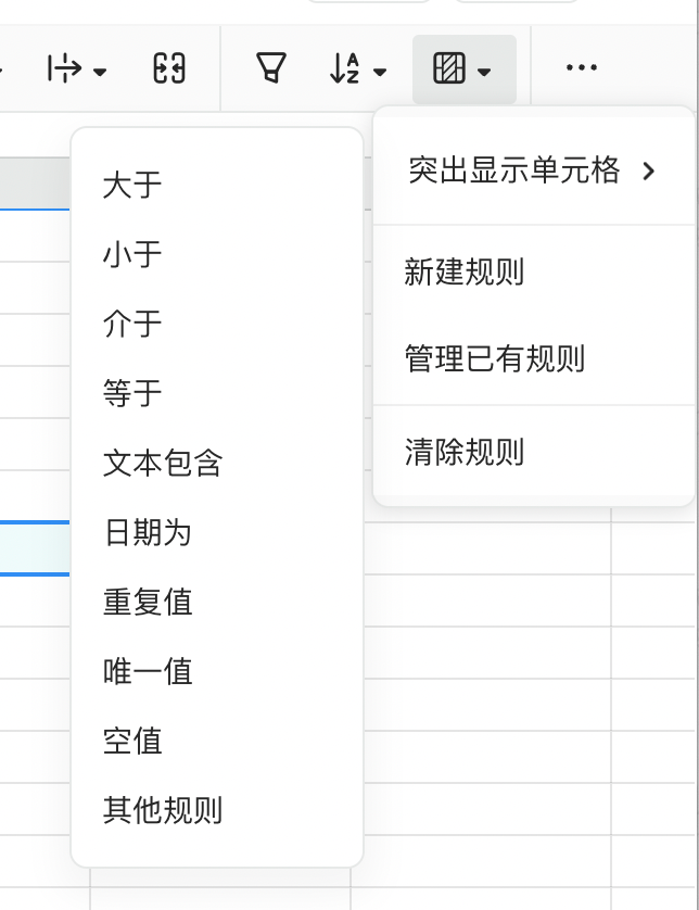 前置了突出显示单元格的功能,让惯用条件格式的人更易操作。你可以直接快捷高亮满足条件的特殊值:重复值、唯一值、空值、大于、介于、文本包含 XX 等。