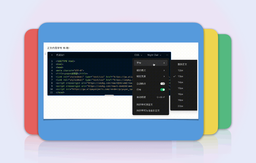 深夜码字的程序员们常反馈说代码块不能调节字号,眼睛都要看瞎了——好的,你的视力我们来保护~ 代码块支持调节字号了,代码块字号可跟随全文字号或单独设置,也支持记住上次的设置和一键同步到全文,字号随心、更舒适地阅读 👇