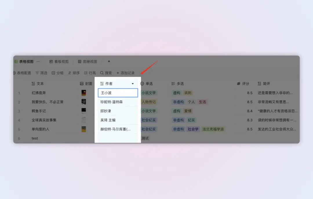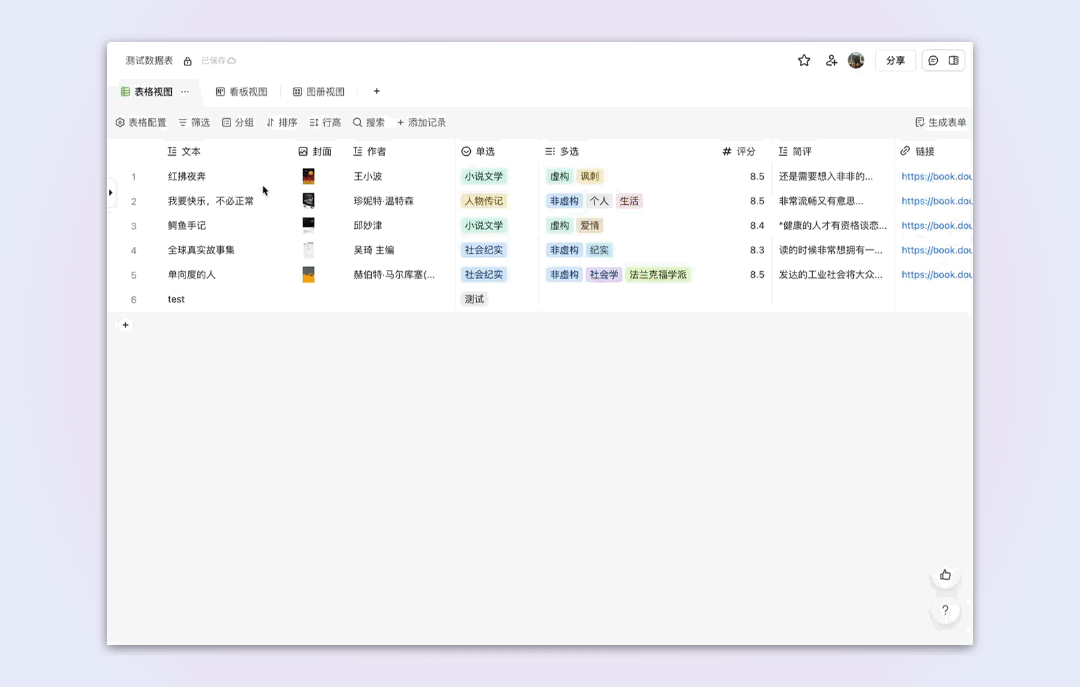 • 使用数据表建立的图书馆 / 书单,可以在行展开正文中添加「读书笔记」;