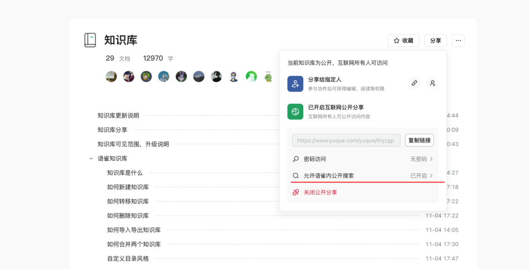 你写的公开内容也希望被搜索到?开启「允许语雀内公开搜索」就可以了: