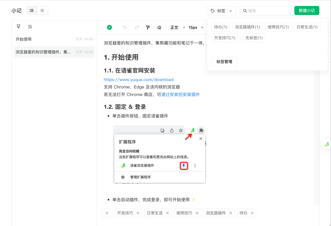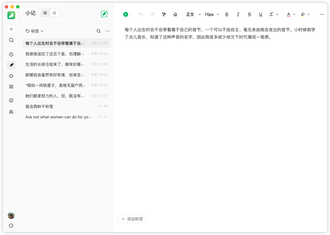 小记列表视图优化,与旧版相比,新建小记与标签管理都移动到列表视图的左侧边栏。整体布局做了优化,新建的入口更符合直觉,右侧编辑区域更加更大更舒适。欢迎体验列表视图,给我们更多反馈。PS: 小编也经常用列表视图来记每日待办,这个视图的优势是切换很方便。