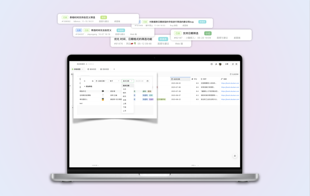 很多用户反馈说希望数据表日期属性支持筛选具体日期和日期范围,本次更新之后日期筛选更强大,支持具体日期以及范围筛选。