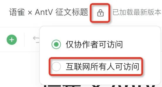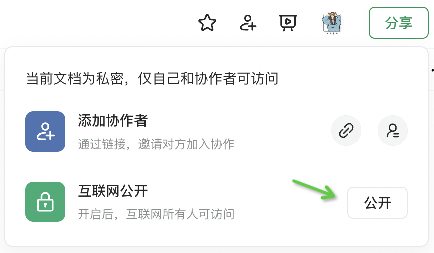 ❶ 点击文档右上角的分享按钮设为公开 ❷ 点击文档标题后的 🔐 设为公开