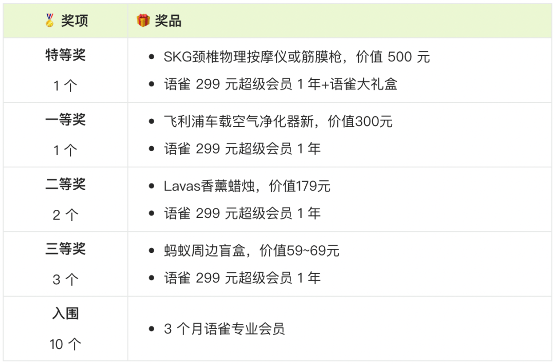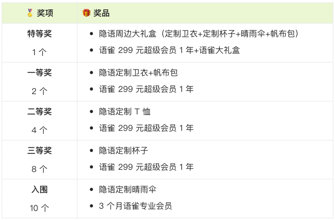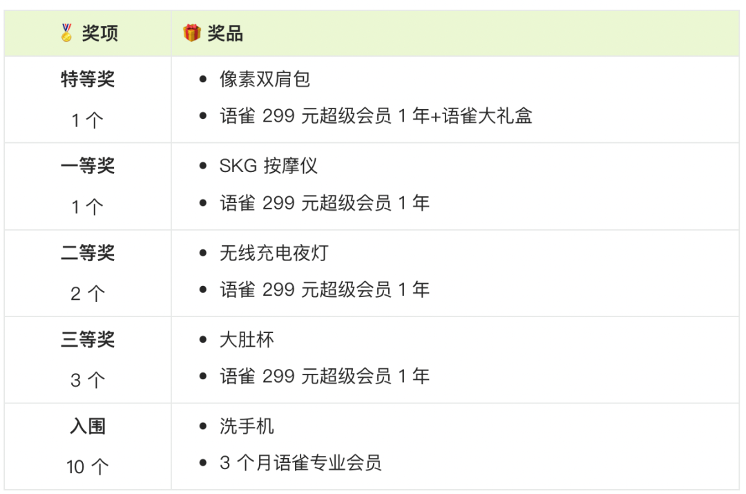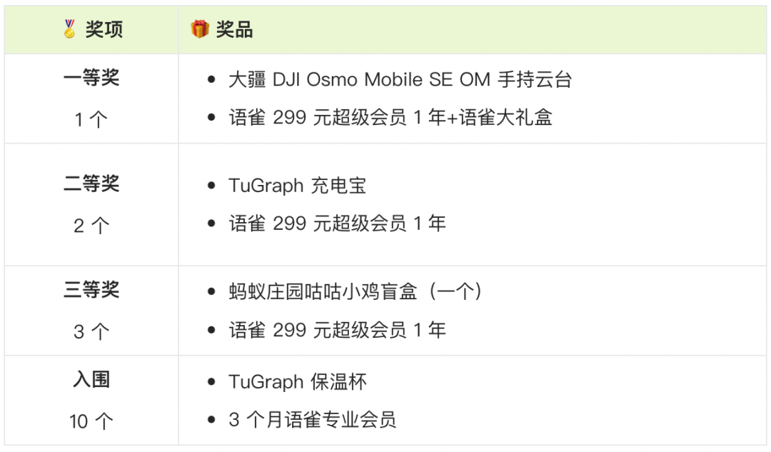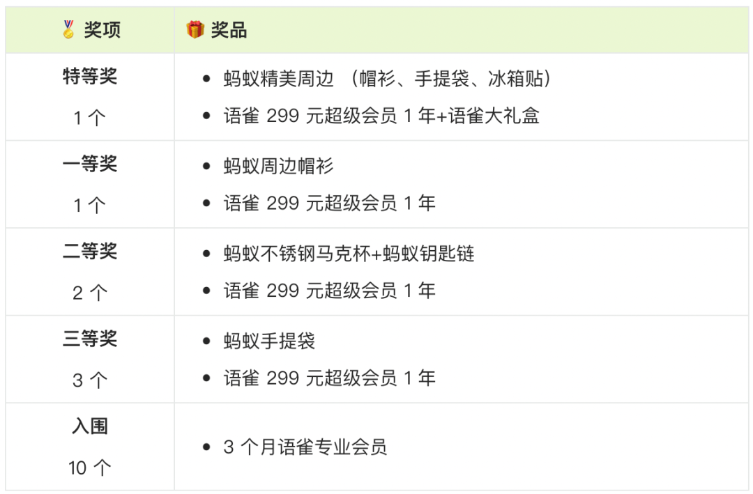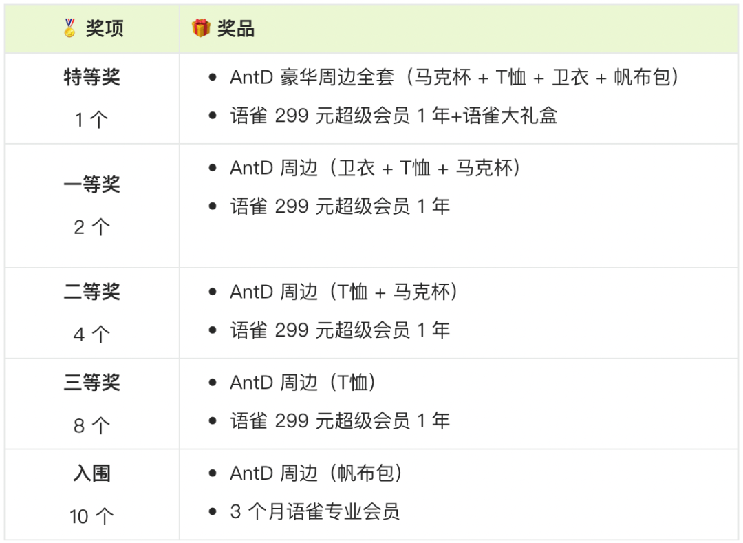 • 获奖可获得语雀超级会员 1 年(价值 299 元)