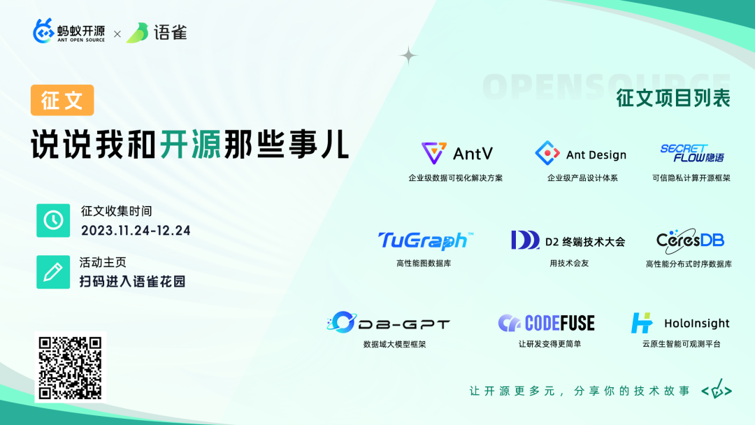 本次活动由 语雀、蚂蚁开源办公室 和 AntV 联合发起,集结了 Ant Design、隐语、TuGraph、CeresDB、DB-GPT、CodeFuse、HoloInsight 等优秀开源社区及 D2 终端技术大会,一起为广大程序员们带来一场集体智慧分享交流活动,征集有意思有价值的开源技术故事。