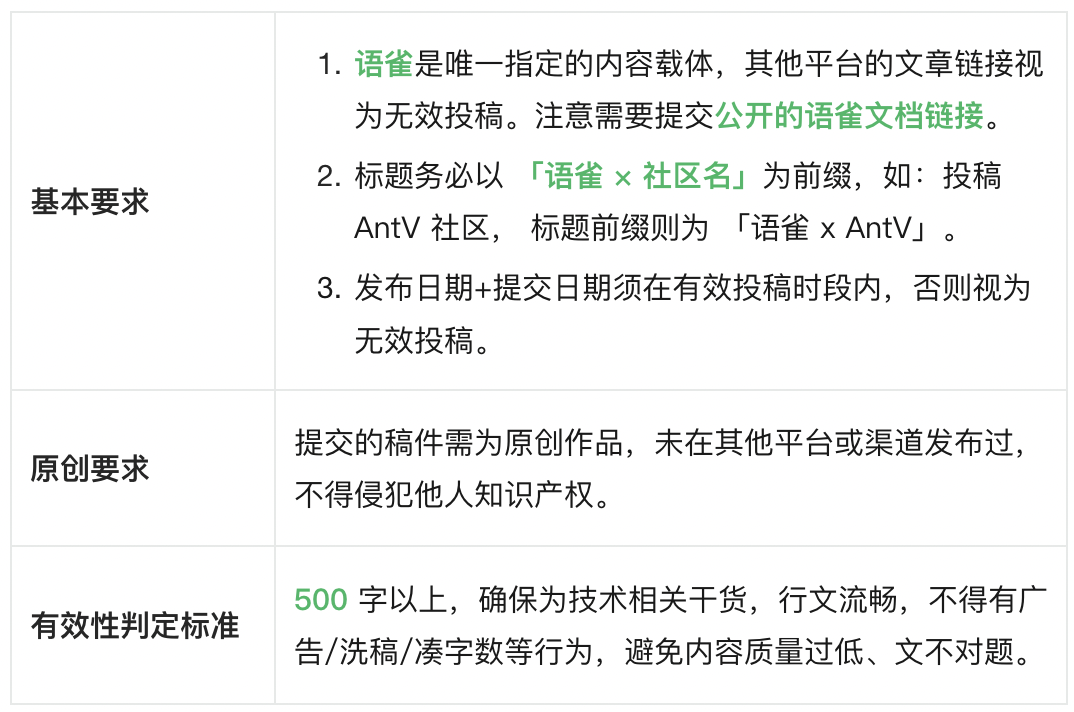 • 参与可得 1 个月会员。参与征文并被社区判定为有效稿件,即可获得 1 个月语雀专业会员