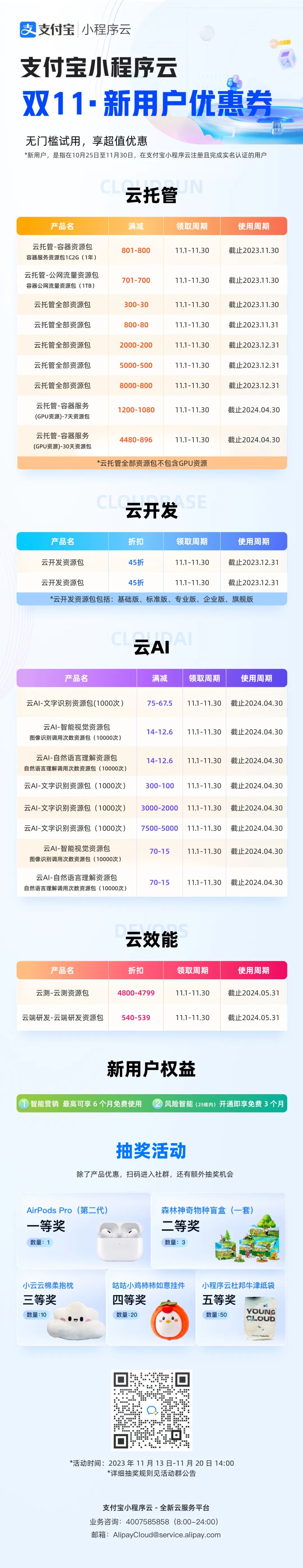 有个事儿想跟大家说下,我的隔壁老大哥 支付宝小程序云 —— 支付宝推出的全新云服务平台,最近在搞双 11 大促。雀雀看了看,挺多产品适合咱个人开发者和有技术团队的企业用户。