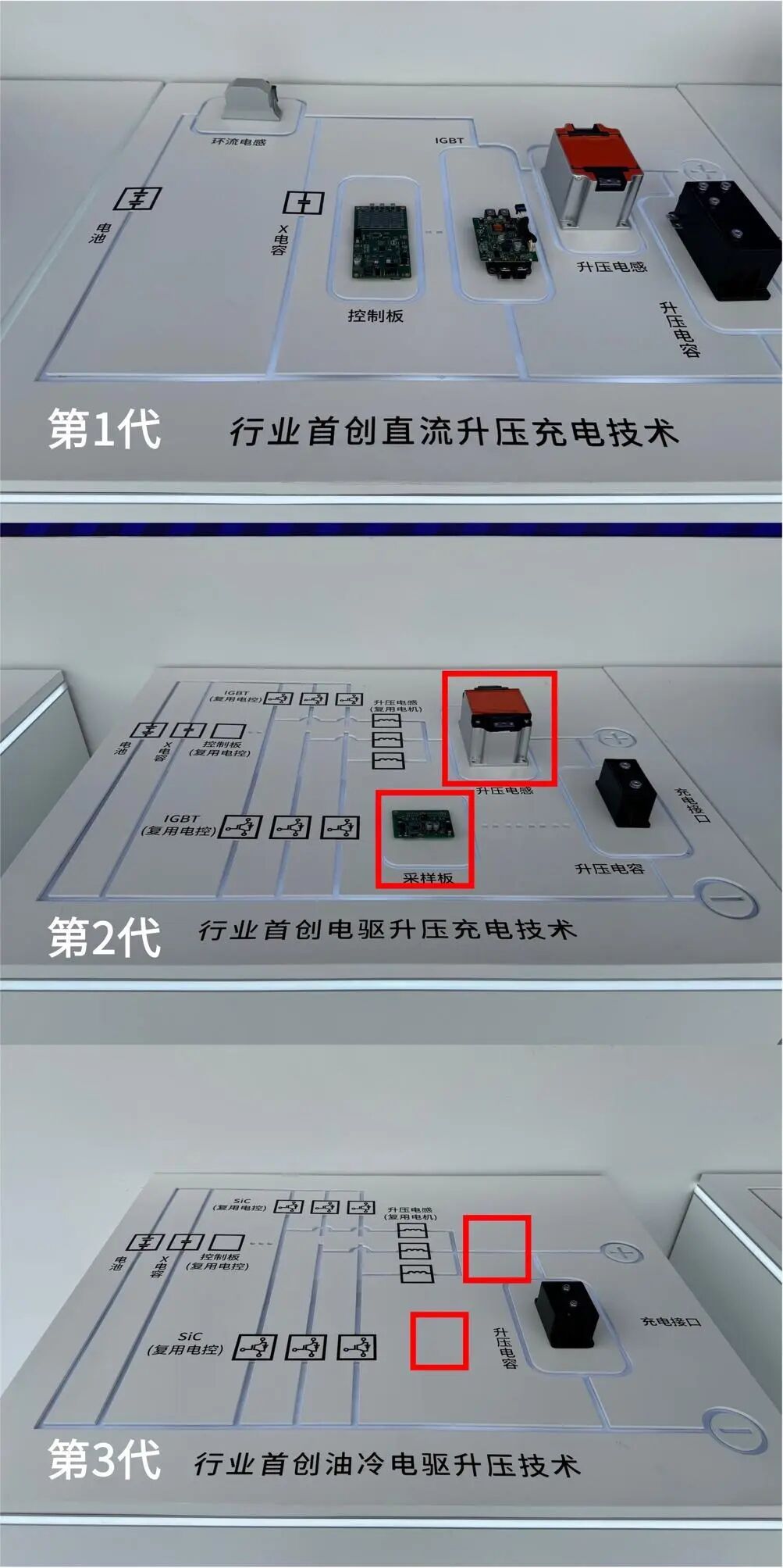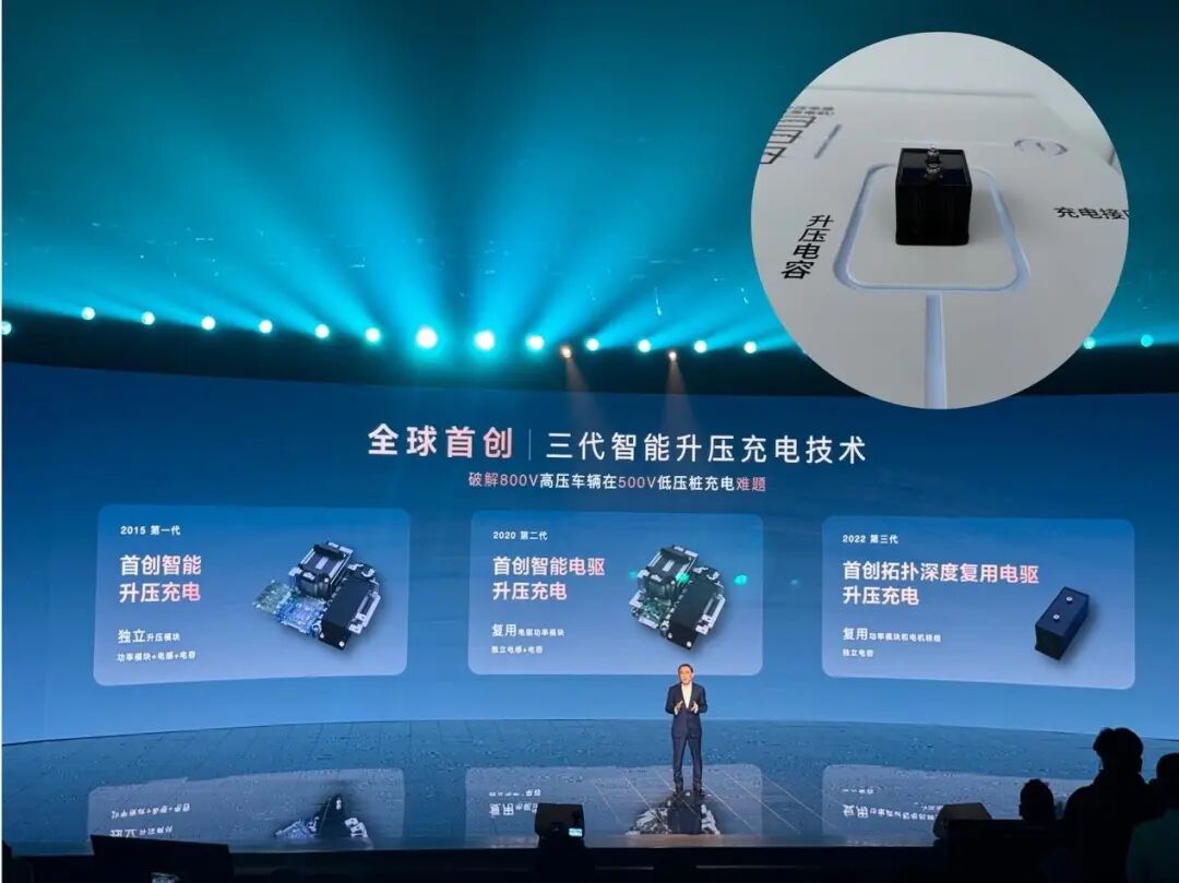 其实比亚迪在升压快充方面已经进化了三代,每一代都在组件和结构上进行了升级,从现场的展示来看,每次升级的有两个特点:组件的优化迭代,以及组件的复用率提高。比如第二代与第三代最大的变化在于,采样板和升压电感器被进一步集成(见上图)。这得益于由原来的IGBT功率模块升级为了SiC碳化硅功率模块,以及独立电容组件的升级。显然,集成化越来越高,带来的效率也是逐步提升。在现场我也询问了该技术是否必须搭配刀片电池,答案是:目前的方案主要针对以刀片电池为核心的升压体系。![]()