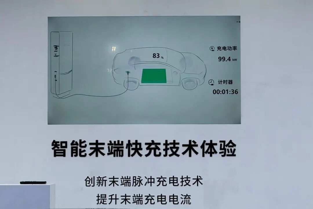 智能末端快充技术,在大电流充电的同时施加负向脉冲放电,降低浓差极化,末端采用自加热智能升温技术,适度提升电池温度,实现末端无损快充。个人理解,智能末端快充技术是脉冲自加热技术的拓展应用。从现场的效果来看,在SOC已经达到80%后,仍能保持近100kW的充电功率(见上图),官方宣称:将末端充电时间从30min缩短至18min。![]()