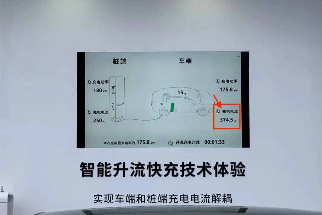 从现场实际展示来看,充电桩电流为250A,而车端的充电电流竟然达到了374.5A,而充电功率也是基本拉满。不过我的第一反应是:这……难道不是抢电吗?现场的工程师微笑着说:我来介绍一下智能升压快充技术。![]()