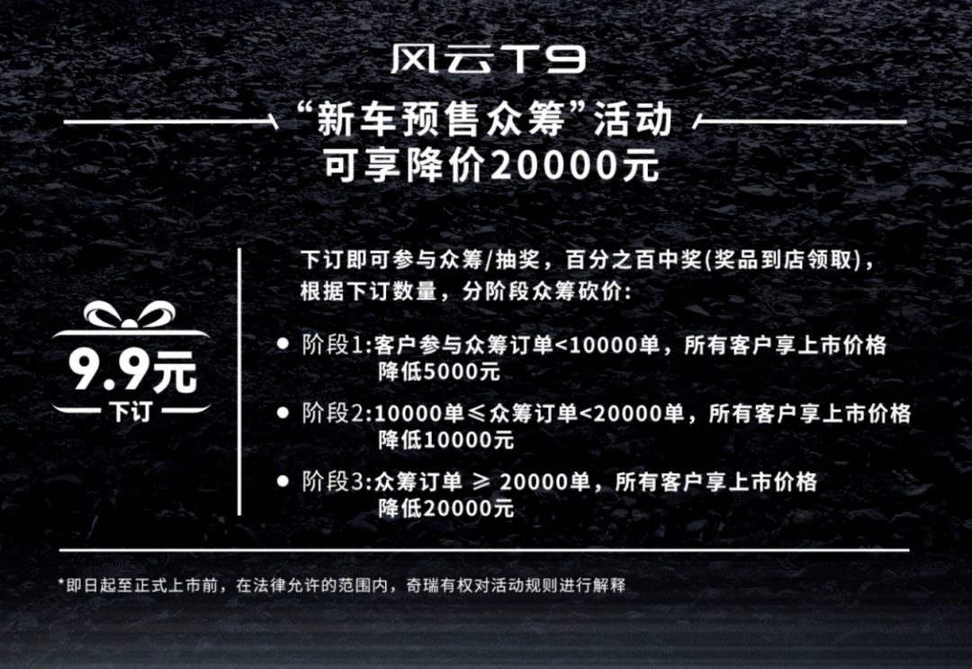 这个车最有意思的,是将价格悬念与订单数绑定。之前官方发布的风云T9预售价为15.99万至19.99万元。不过奇瑞随后表示,当订单超过2万单的时候,风云T9的上市价格将直降2万元。![]()