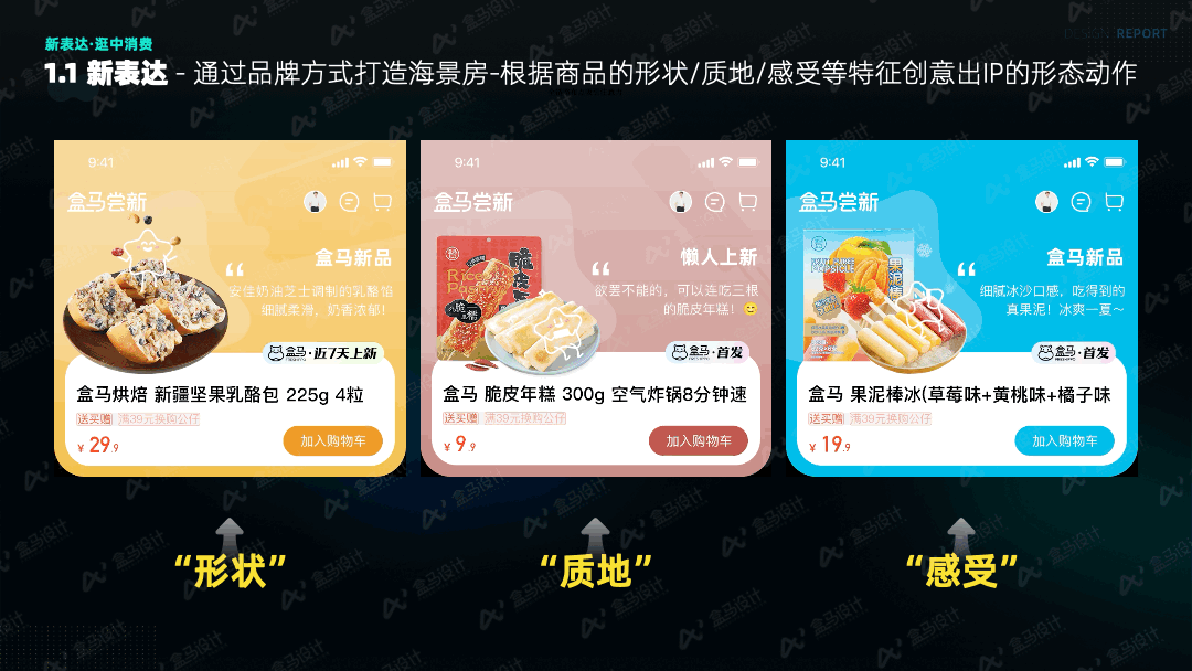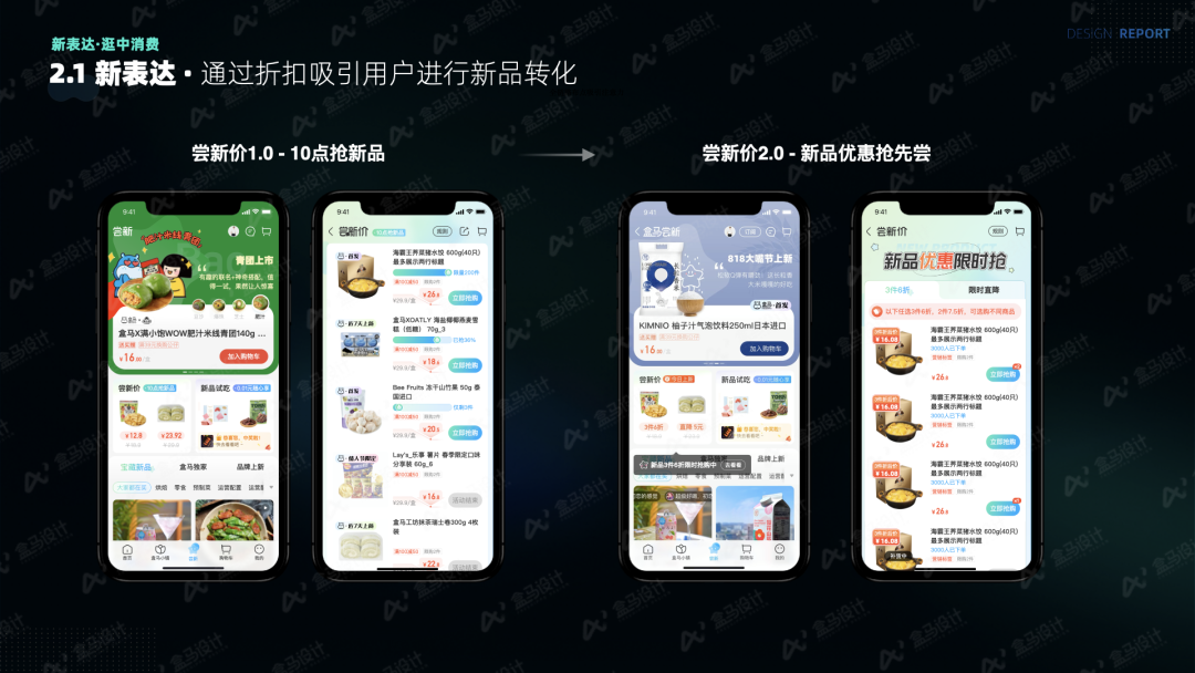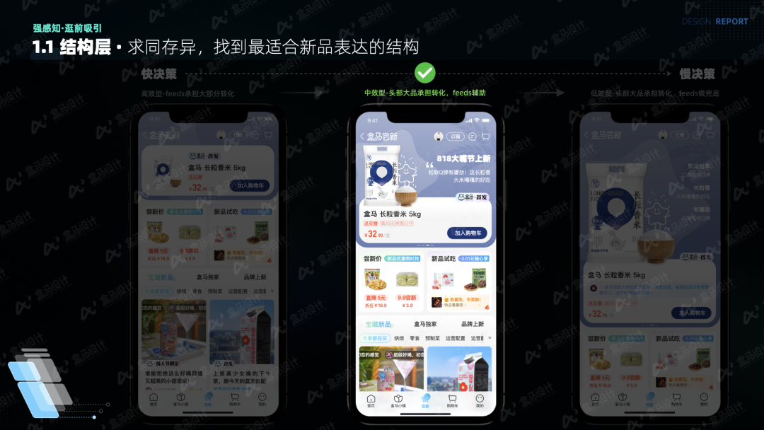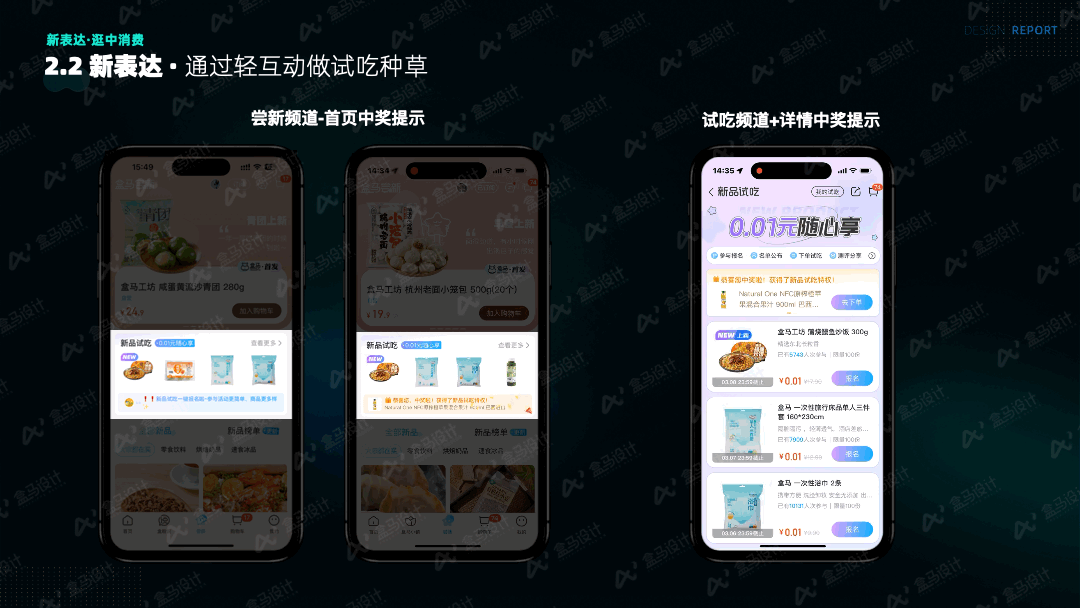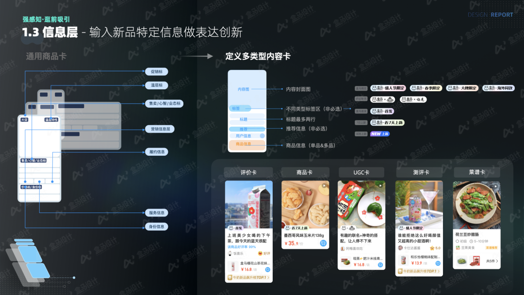 盒马 APP 历经多轮版本优化迭代,其框架规范及信息语言已趋于稳定,符合盒马用户的操作习惯和认知模式。尝新频道在信息呈现上采用了差异化设计,既遵循了现有规范框架,又凸显了尝新品的特色。盒马的信息结构现有一排一、一排二及一排三这几种样式。其中,一排一适合展示信息丰富的商品介绍,一排二更能凸显图片的视觉冲击力,一排三则契合高效表达的需求。体验过部分运营筛选的盒马新品后,我们对比了新品的现有信息字段。相对常规商品,新品的标签和主图更具吸引力,这是两者的差异所在。基于此,我们选用了最具视觉表现力的一排二样式,并强化了新品标签,同时制作了多种不同类型的标签,多角度阐释新品特性,例如“季节限定”“情人节限定”“盒马 X 商家联名款”“7天上新”等标签,实现了在原始商品信息基础上的差异化表达。此外,我们还在商品卡的基础上拓展了其他新品卡片,如评价卡、UGC 卡、菜谱卡等,以展示不同的信息。![]()