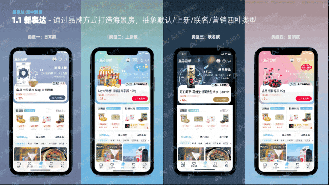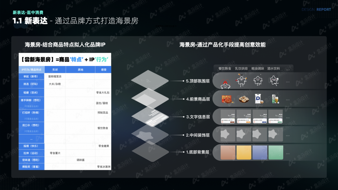 通过频道子品牌的基础形态叠加表情与微动效来赋予每种食物情绪,来唤起用户潜在消费需求,生动顺畅地表达商品。我们将海景房分为底部背景层、中间装饰层、商品信息层、前景商品层、顶部氛围层进行清晰的分层梳理和表达:![]()