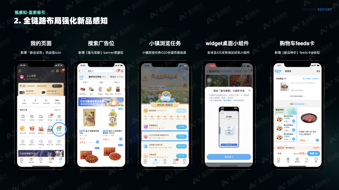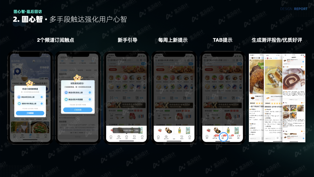 在转化环节,盒马对用户提交的真实测评内容进行审核后,通过feeds卡的形式进行承接和扩散,让更多用户看见来自消费者的真实反馈,从而增强其购买新品的信心,有力促进了新品的销售转化。后续也希望将这部分优质内容在基础链路进行有效分发,辅助用户的购买决策。# 多手段触达强化用户心智