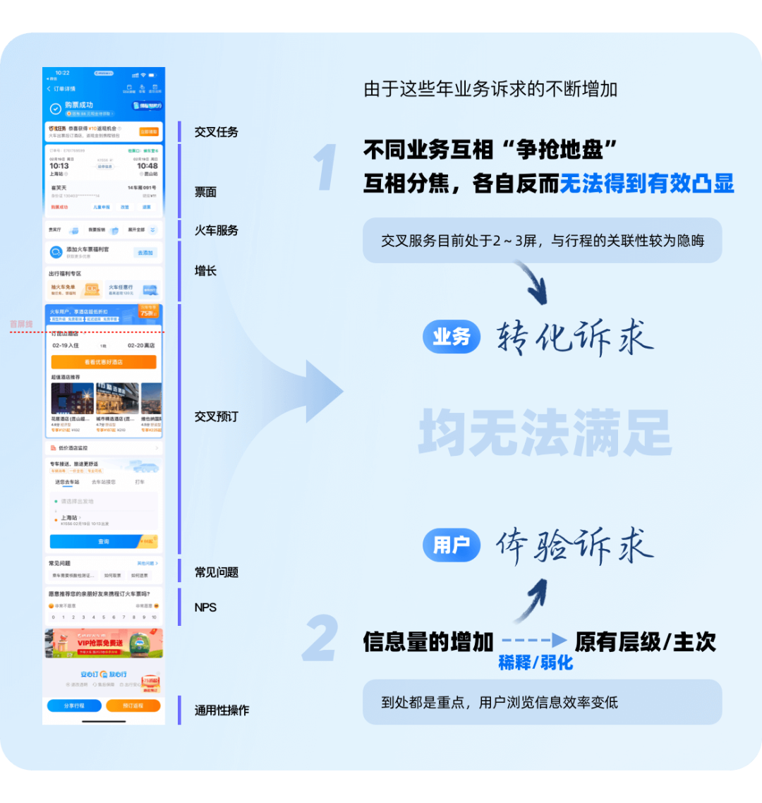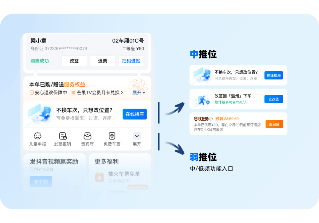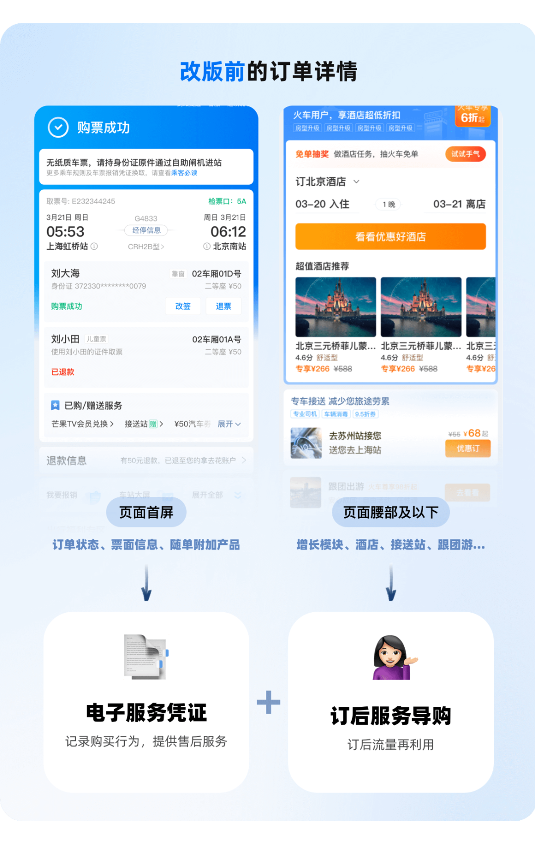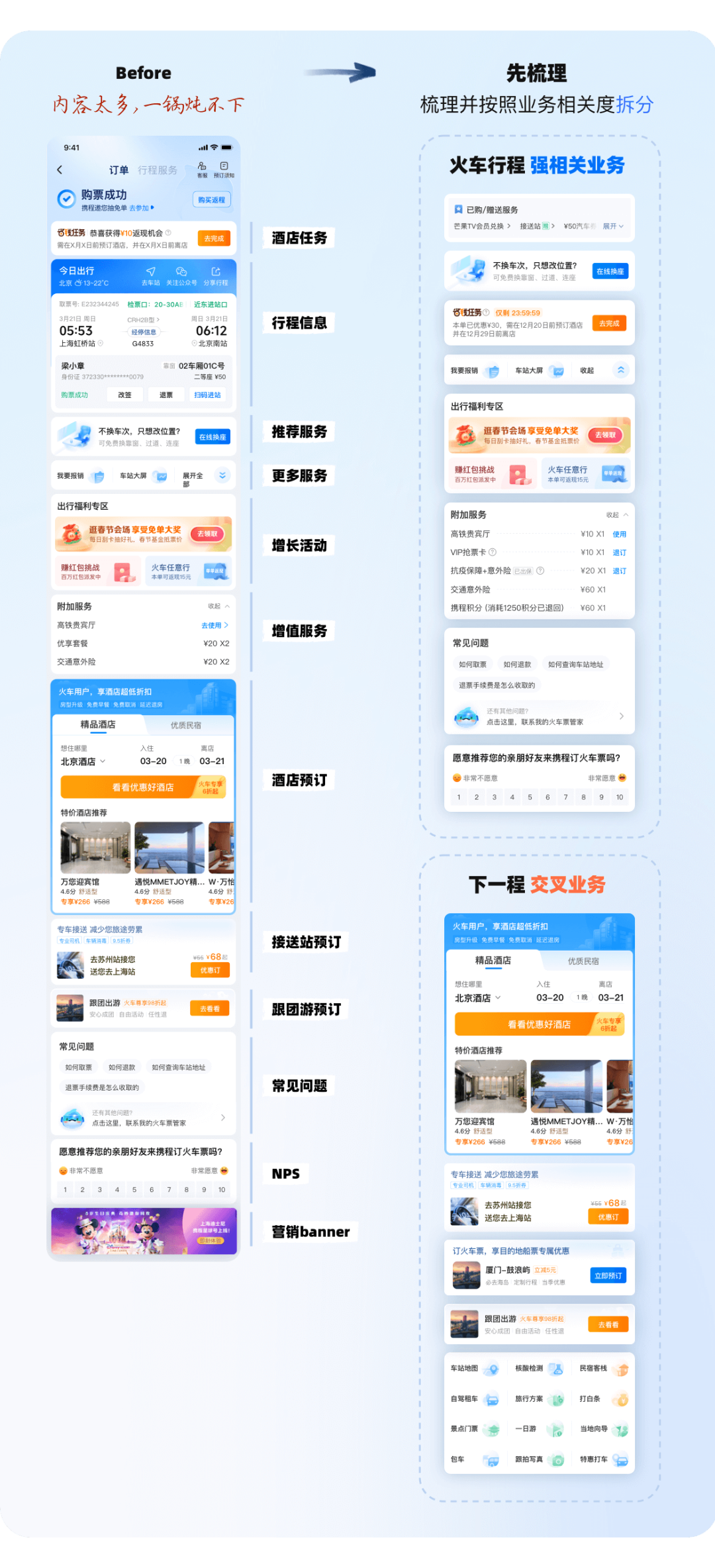 通过页面框架重组,一是让繁多的火车服务功能入口出现在更合适的地方,用户找寻更为便捷,降低服务引发率;二是解决交叉业务位置靠下,难曝光的问题,提升火车订后交叉业务曝光率与交叉覆盖率。