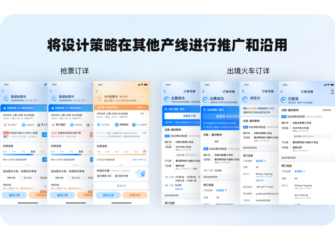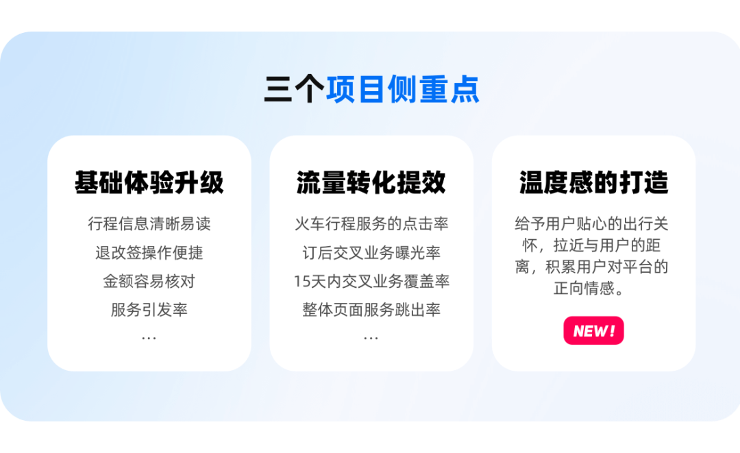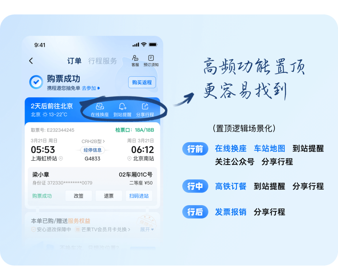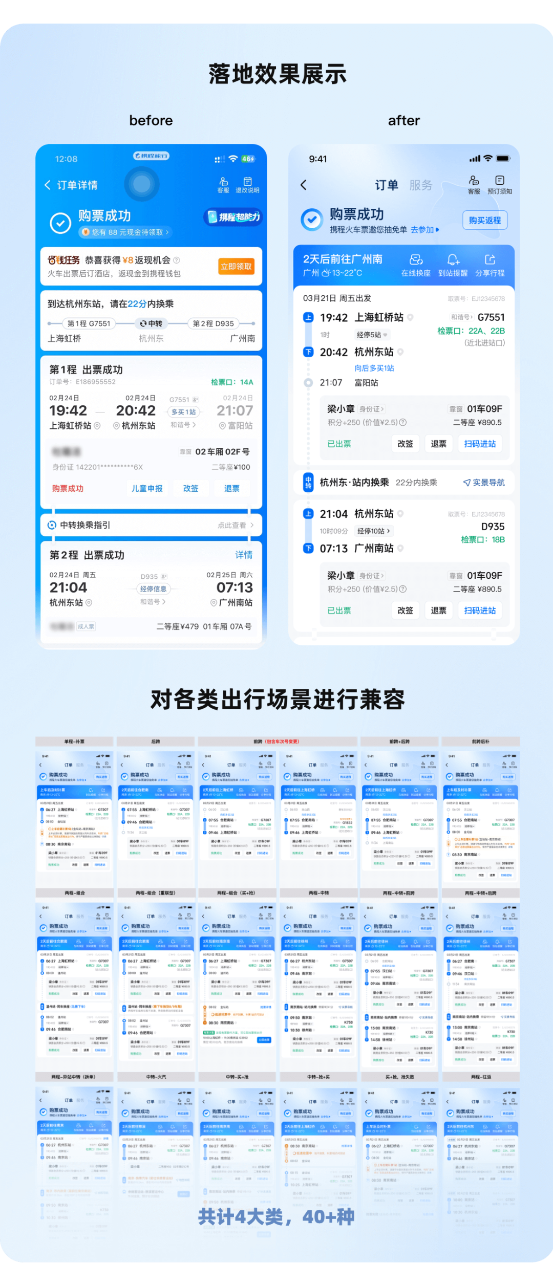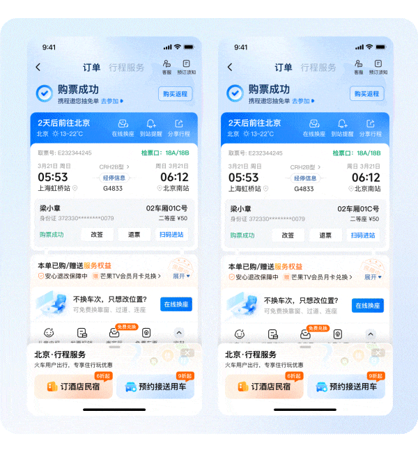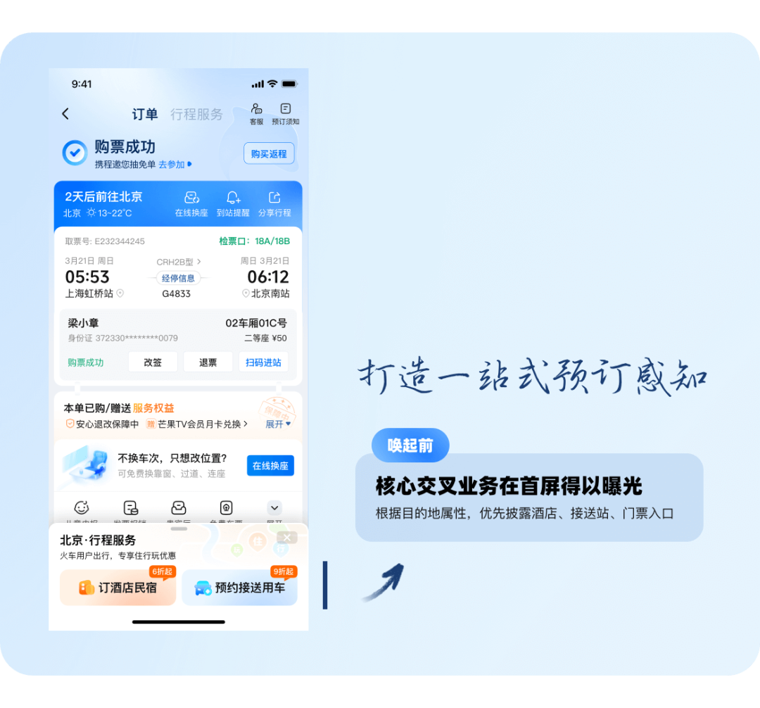 通过页面框架重组,一是让繁多的火车服务功能入口出现在更合适的地方,用户找寻更为便捷,降低服务引发率;二是解决交叉业务位置靠下,难曝光的问题,提升火车订后交叉业务曝光率与交叉覆盖率。